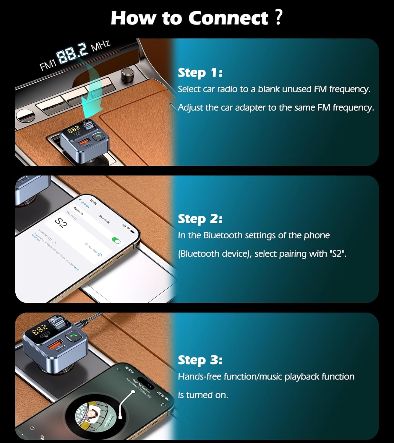 🌐 UNIVERSAL COMPATIBILITY FOR ALL YOUR GEAR: Bluetooth cigarette adapter for car works with all Bluetooth devices such as iPhones (16/15/14/13), iPads, Samsung Galaxies, Google Pixels, and more. No app required, just plug into your car cigarette lighter, tune to the FM frequency, pair your phone, and play instantly.