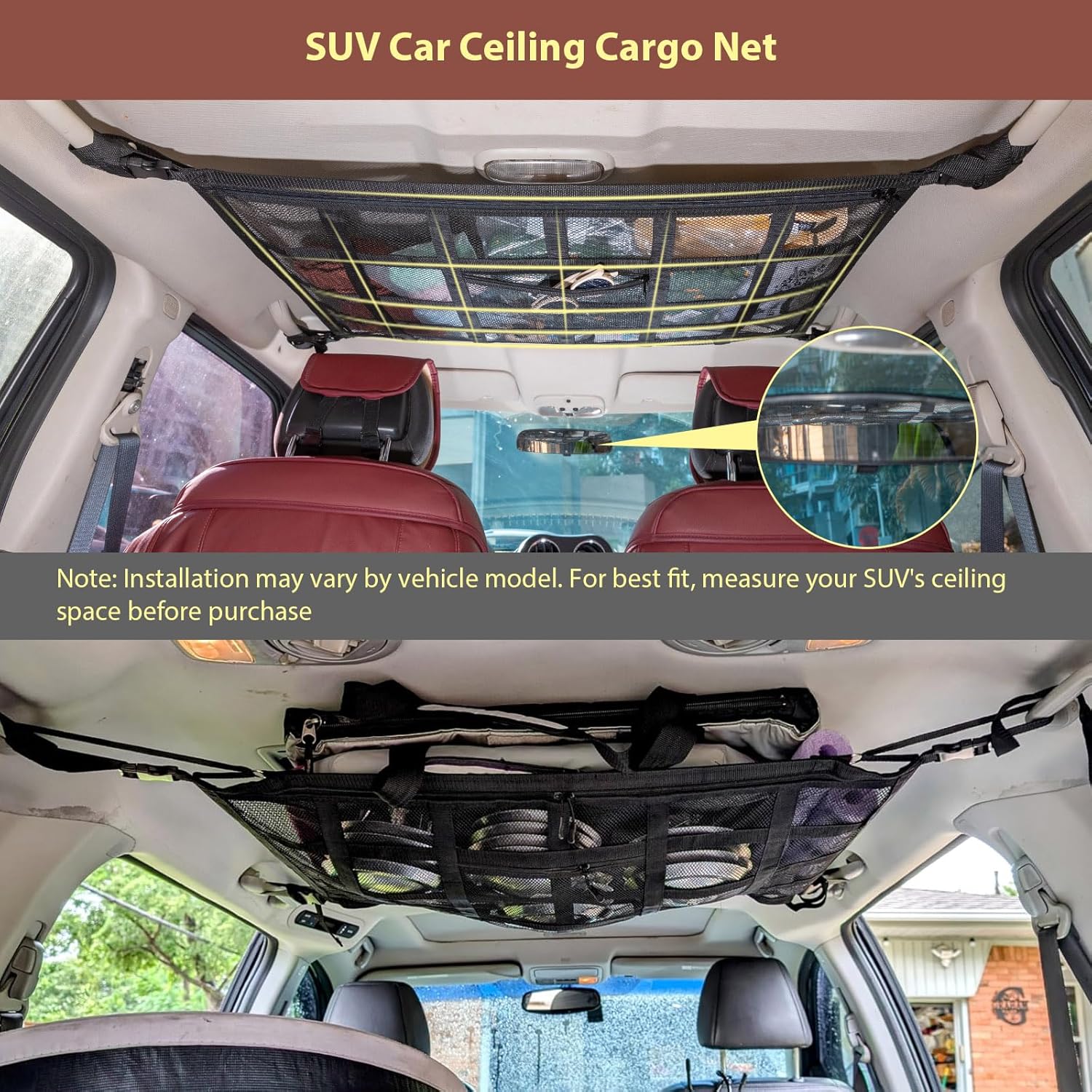 【Upgraded Car Ceiling Cargo Net】4th generation car ceiling cargo net,engineered for storage and organization during car camping, road trips, and daily van life.Featuring 9 reinforced straps,an added pocket within the double-layer mesh,and a dual-end zipper design,this overhead storage net allows easy access and secure item placement.Perfect as a truck or SUV roof storage solution.Note: Installation may vary by vehicle model. For the best fit, please measure the space on your car roof before purchase