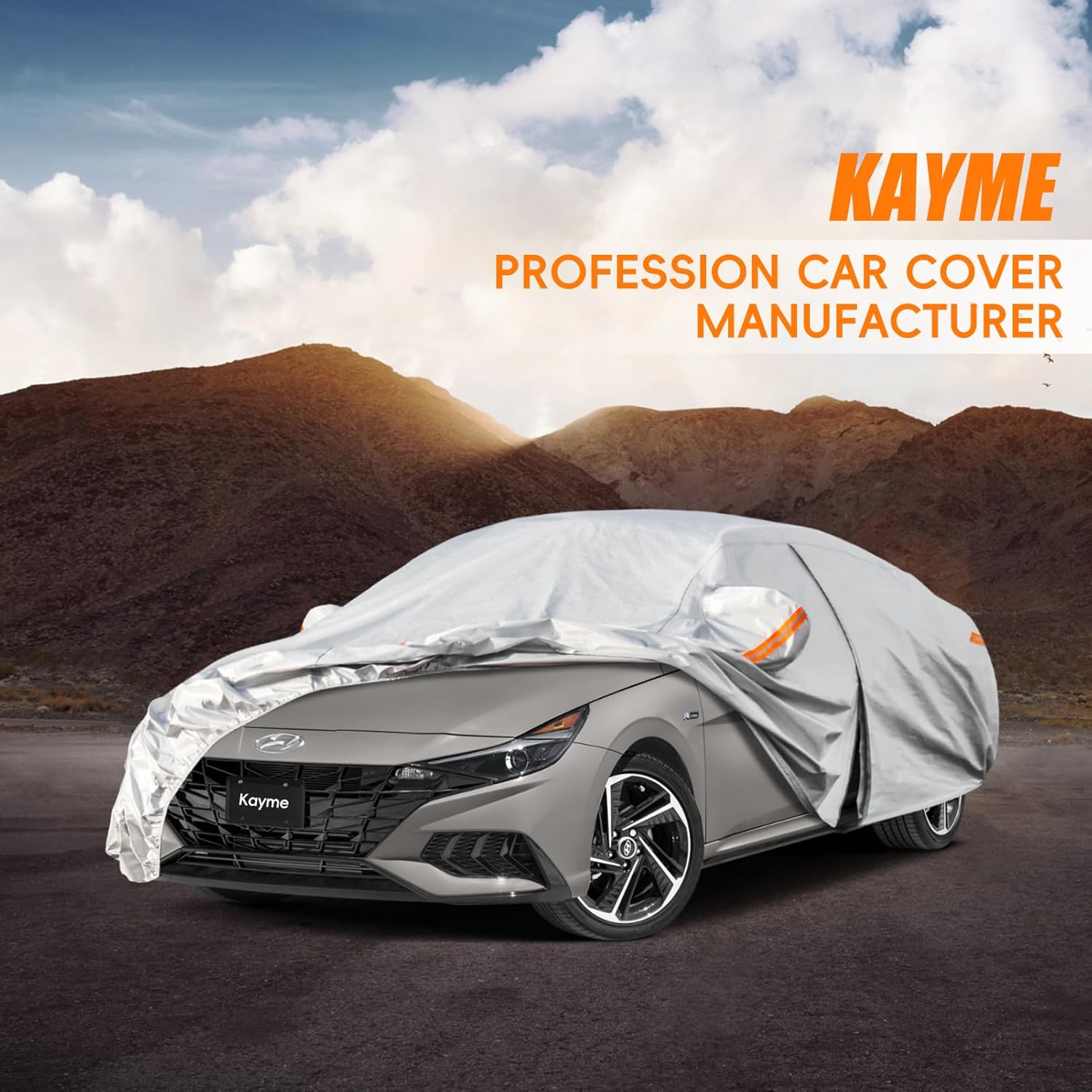 【Premium Material】-Kayme 6 layers car cover is made of heavy duty material. 1 PE&PEVA is 100% waterproof, It’s great for rainproof snowproofing. 2 High reflective aluminum is good at sunproof and anti-uv, Keep the car cool in the summer. 3 Thicker and soft cotton will protect vehicle painting. Kayme multi-layer material is much thicker and more durable than other similar products.