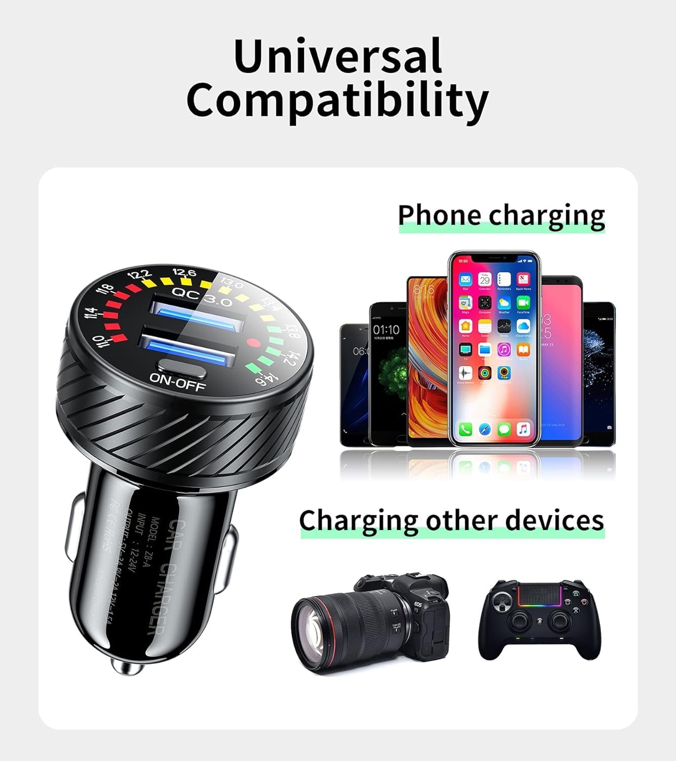 Premium Materials and Design: KEWIG Car charger is made of high temperature and low temperature resistant materials, which can be used in -20-60(℃) working environment, Equipped with colorful voltmeter which can monitor the voltage value of the car battery in real time, allowing you to know the battery level of the car at any time, Colored led lights can also help you easily find the car charger usb charging port in a dark environment