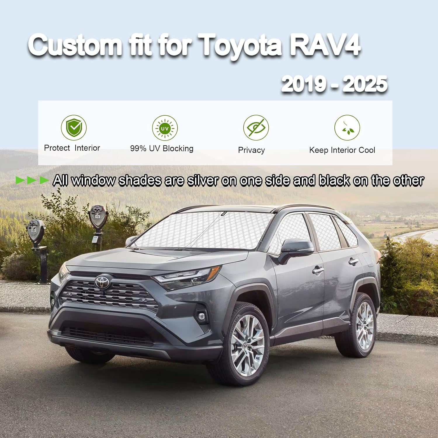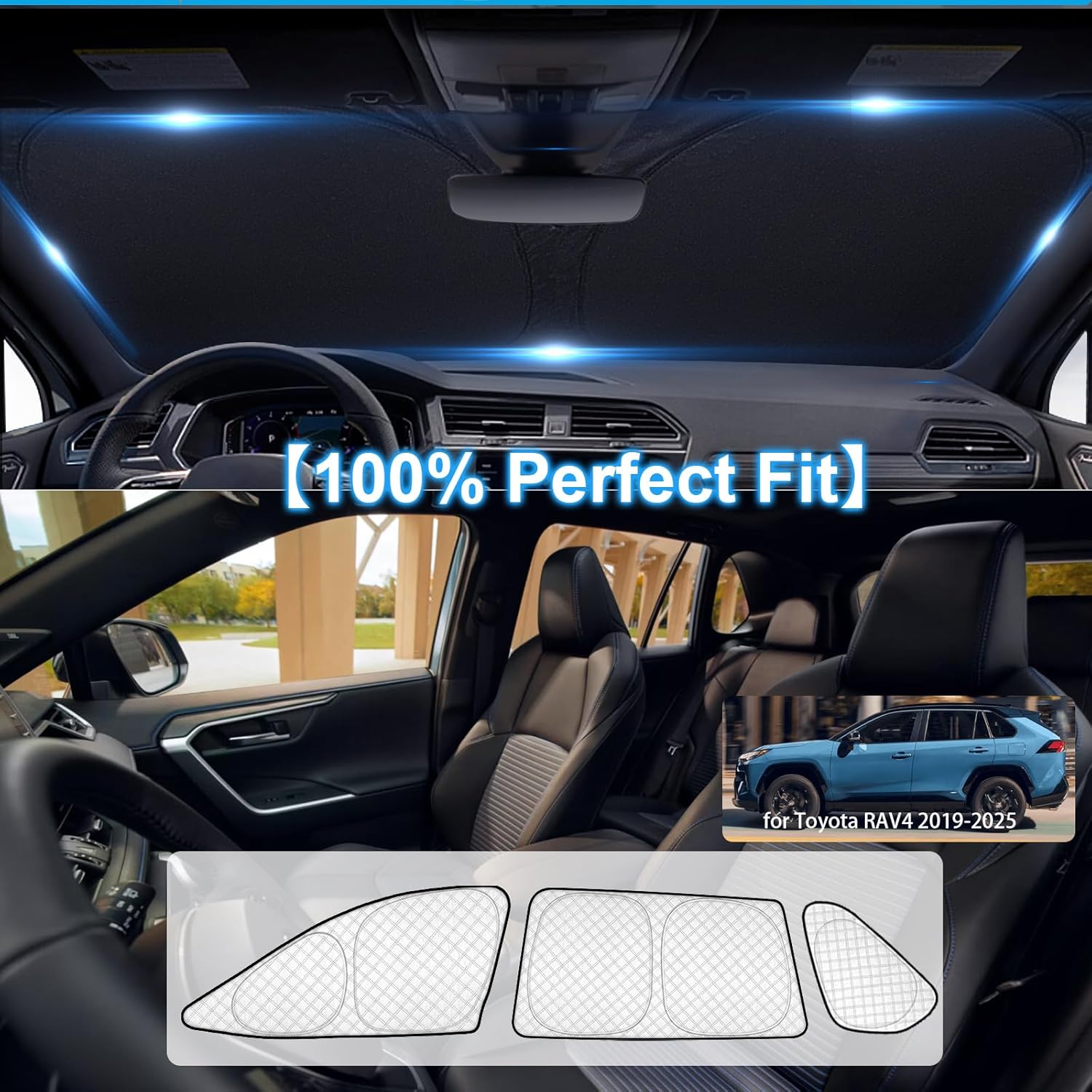 【100% Perfect Fit】:The car window shade is specially designed for Toyota RAV4 2019 2020 2021 2022 2023 2024 2025.No Gap,100% Perfect fit.The window shades for the car are designed to cover the whole exterior window,Best for baby in the car and overnight car camping essentials. Protect your car from early morning light disturbances and maintain privacy when car camping(Tips: Please confirm the model of your car before ordering) .