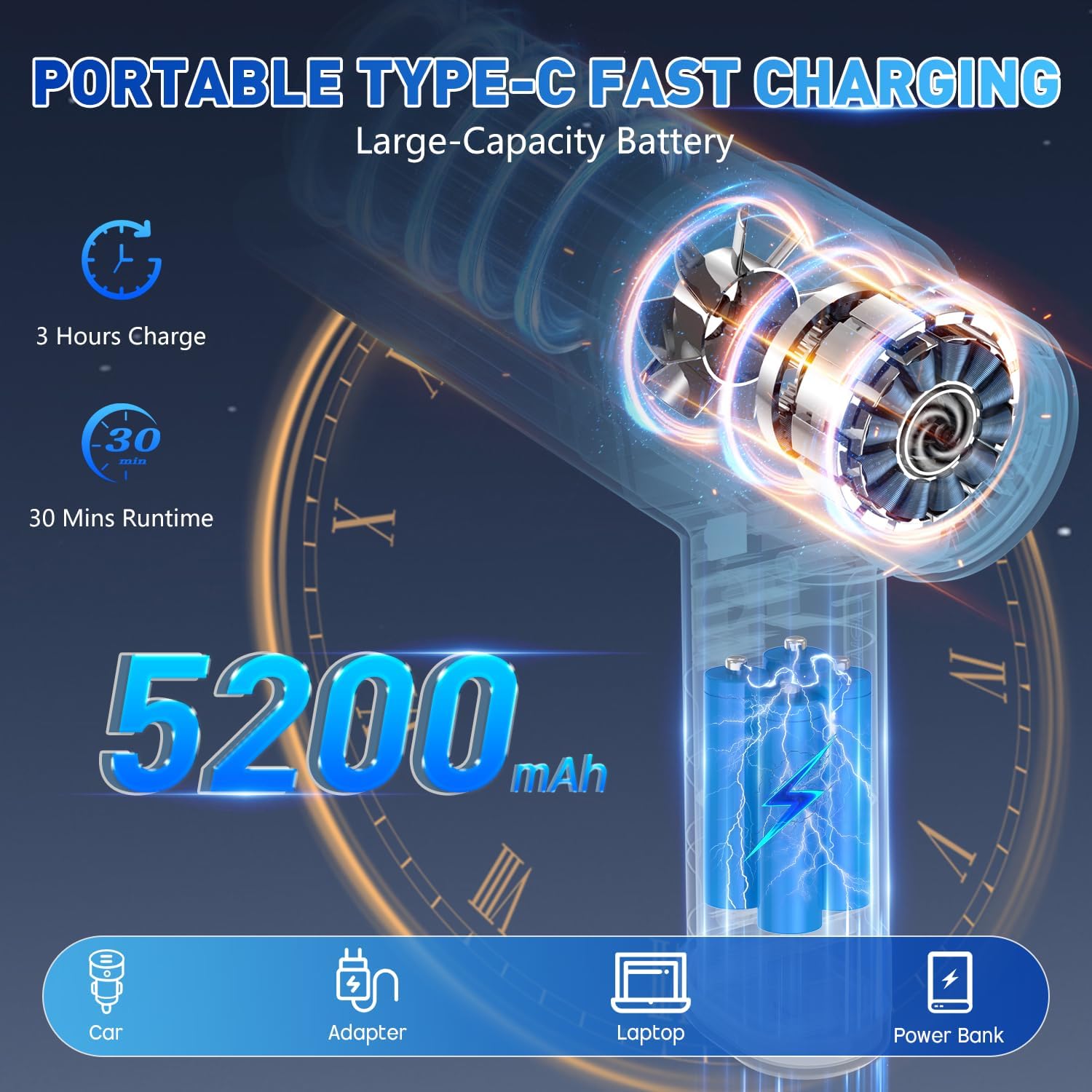 🔋【Type-C Fast Charging & 5200mAh Long-Lasting Battery】This hand vacuum cordless rechargeable is built with a 5200mAh rechargeable battery, delivering consistent, powerful performance. Equipped with a Type-C charging port, it supports versatile charging methods — you can easily charge it using a car charger, a power bank, a laptop, or a 5V/2A adapter. With fast charging technology, it charges fully in 3 hours (red light when charging, green when full), and offers up to 30 minutes of continuous use, perfect for cleaning tasks at home, in the car, or in the office