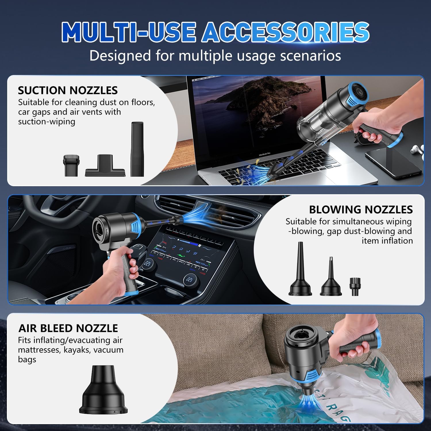 🧰【7 Professional Accessories for Multi-Scenario Use】This car vacuum portable cordless has 7 accessories covering suction, blowing, inflation, and air evacuation. The floor brush cleans floors and furniture; the suction nozzle targets tight gaps like car doors; the brush suction nozzle combines suction and wiping for seat cushions, ac vents. The blowing nozzle blasts dust from keyboards, window gaps; the brush blow nozzle enables simultaneous wiping & blowing. The inflatable nozzle inflates swim rings; the air bleed nozzle handles air mattresses (inflation) and vacuum bags (air evacuation)—meeting home, car, and everyday use & casual activities