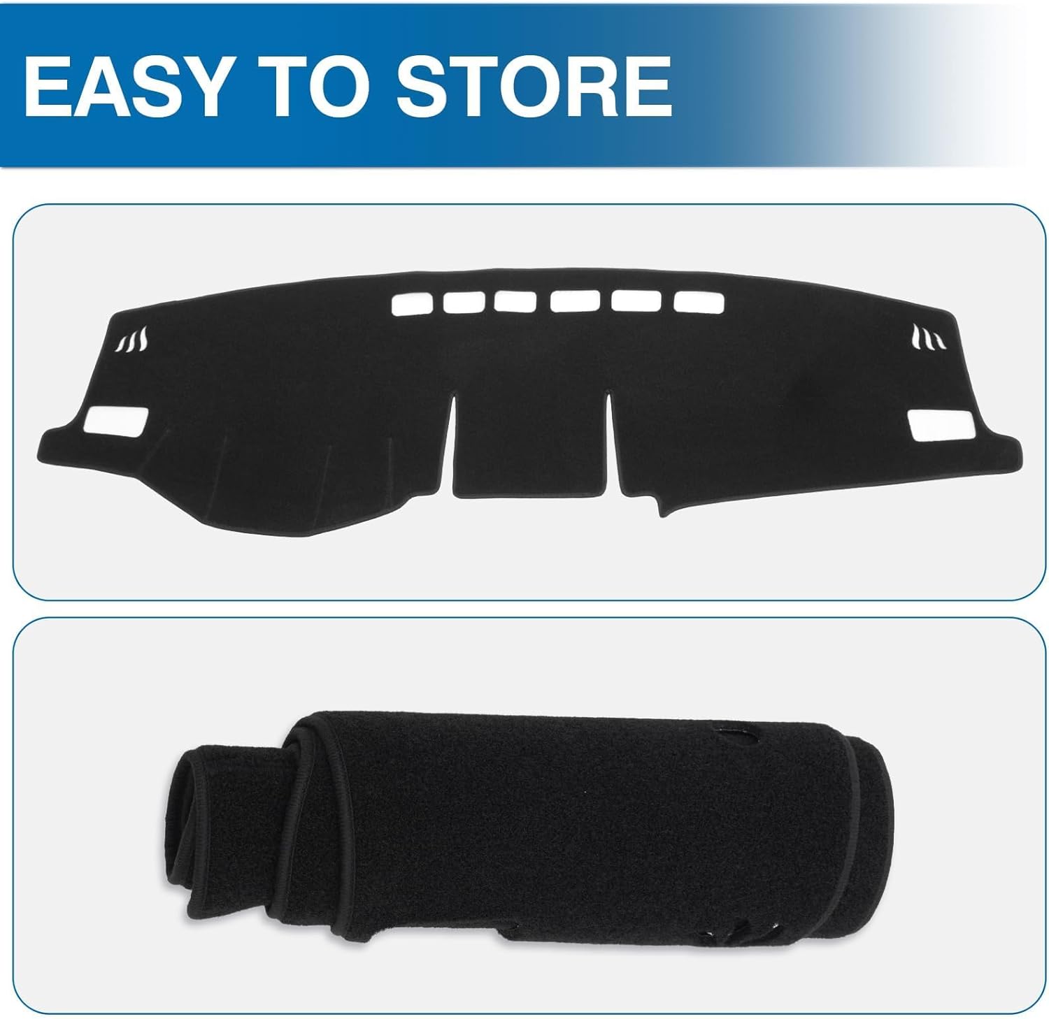 [Install in seconds, store in a snap] Our foldable dashboard mat is incredibly effortless to set up—simply wipe down your dashboard first, then lay the mat in place. For extra security, the included double-sided tape effectively eliminates any slippage. When not in use, the car dashboard cover can be rolled up for storage.