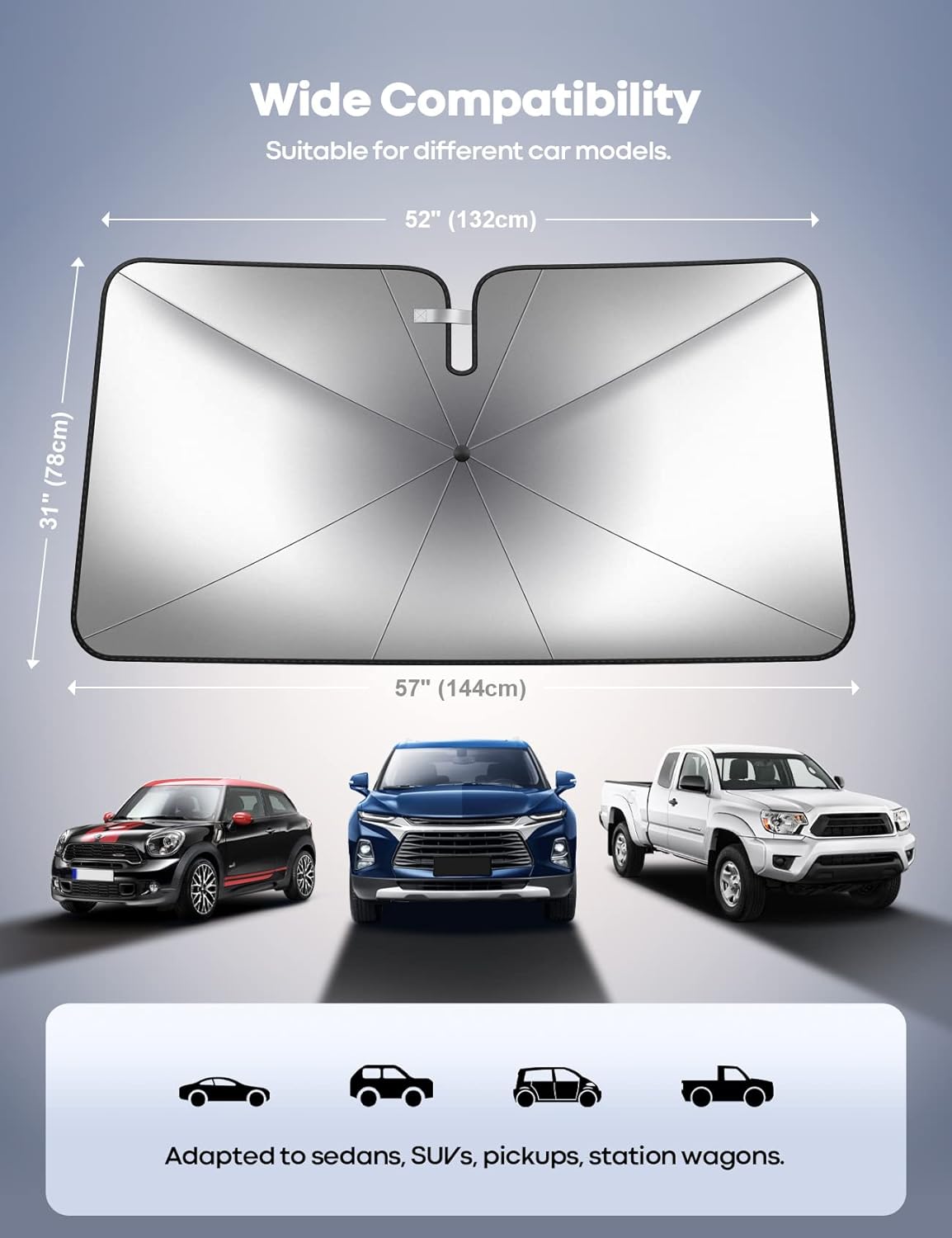 【 Universal Size】 With universal size of 31″ (Wide), 52″ (Top side), 57″ (Bottom side), Can be adapted to more different models with bendable umbrella skeletons. Recommended to measure the size of your car windshield before order to check if it is applicable.