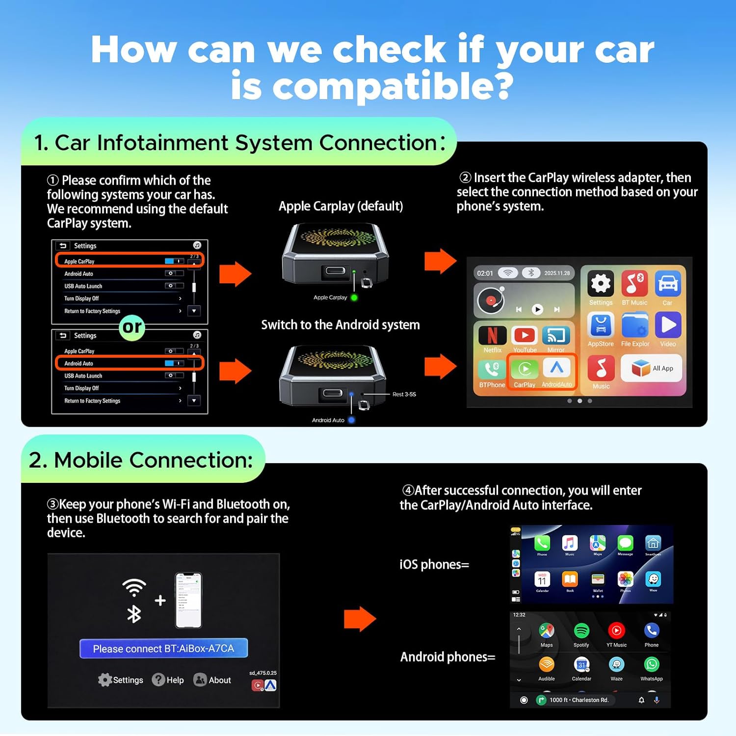 Set It Once, Enjoy Forever:Simplicity perfected! Just switch your car system to Apple CarPlay, plug the android auto wireless adapter into USB port, and pair your phone via Bluetooth and WiFi, and go. After the first connection, your phone automatically reconnects every time you start the car — no manual setup, no hassle. (𝐍𝐨𝐭 𝐜𝐨𝐦𝐩𝐚𝐭𝐢𝐛𝐥𝐞 𝐰𝐢𝐭𝐡 𝐁𝐌𝐖 𝐨𝐫 𝐓𝐞𝐬𝐥𝐚 𝐯𝐞𝐡𝐢𝐜𝐥𝐞𝐬.)