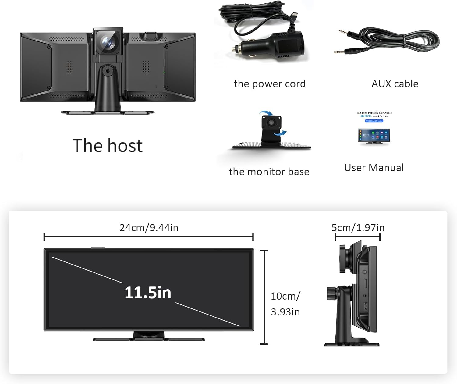 Largest 11.5″Wireless Apple CarPlay Screen for Car–Portable Carplay & Android Auto Touchscreen Car Stereo with App Control, 4K Dash Cam, Backup Camera, GPS, Mirror Link, Voice Control,for All Vehicles
