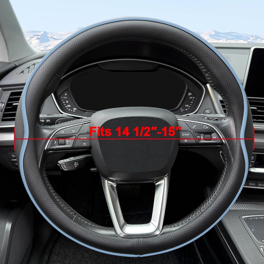 Leather Steering Wheel Cover, with Anti-Slip Stripe Design – Enhanced Grip, Fashion Style, Safe, Non-Slip, Breathable. Upgrade car Interior,Black Blue