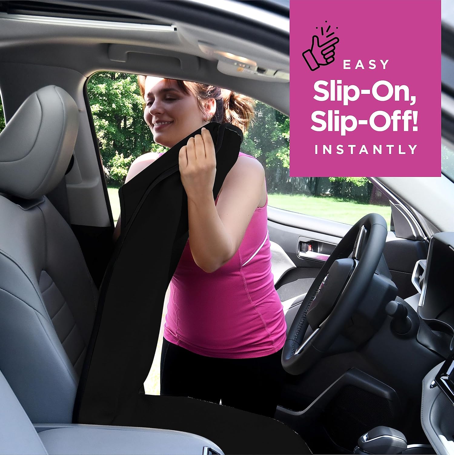 I have found with my leather seats, that using SPF (necessary for me!) on my legs in the summer has caused my neutral-toned leather seats to be stained an icky yellow color, which I cannot completely get out. I purchased this seat cover as a solution to my making the stain worse. It is very easy to “install”(!), and has protected my driver’s side seat where I installed it, from further staining. It stays in place 98% of the time with the little non-slide “dots” on the underside, which hold it in place. There are times when it has moved, due to the type of clothing I might wear, but it’s so easy to re-align the cover that it’s a non-issue for me. It’s not an elegant look, but it is a very practical and smart way, IMO, to protect your vehicle’s seat upholstery. I’d buy it again if I ever need to replace it (it wears very well!), or if I get a new vehicle.