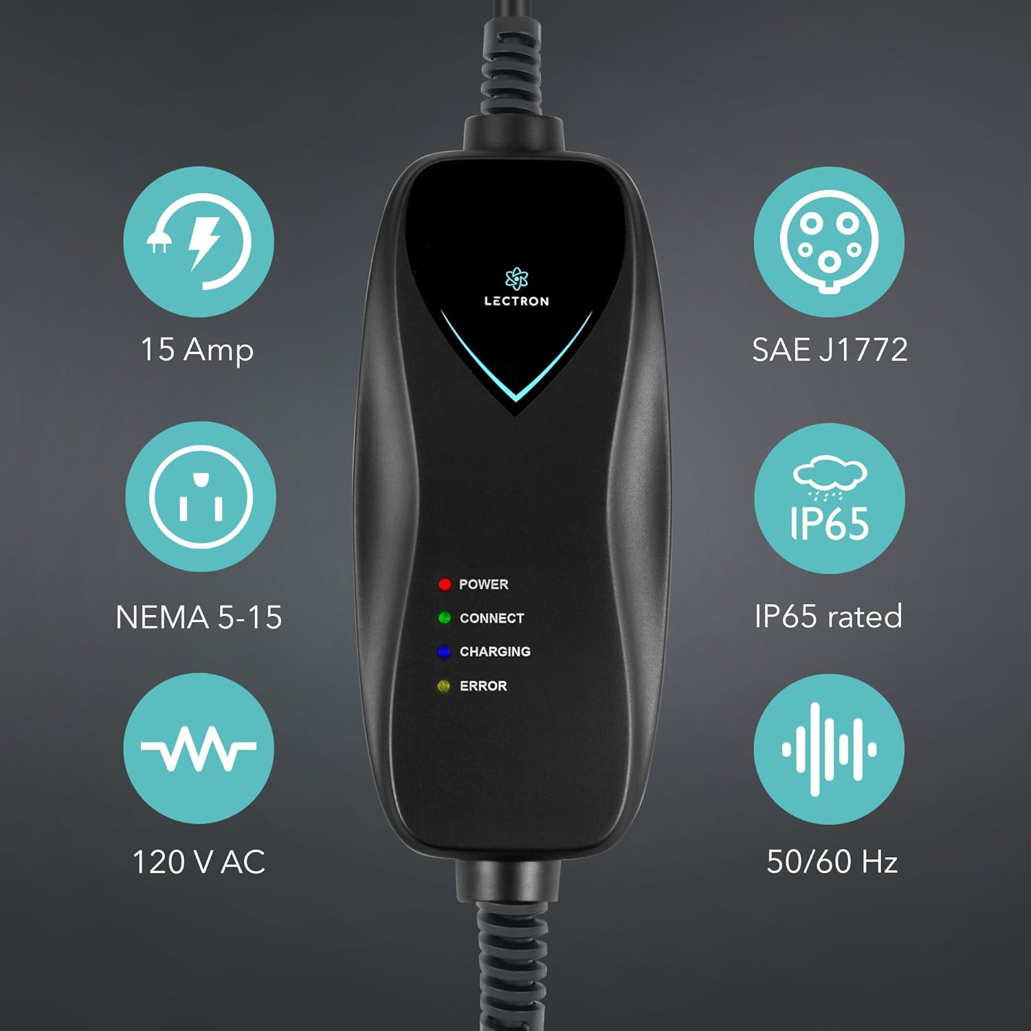 Lectron Level 1 EV Charger – ETL Certified, 120V, 15 Amp, 16 ft Extension Cord & J1772 Cable – Portable Electric Car Charger for J1772 EVs with NEMA 5-15 Plug