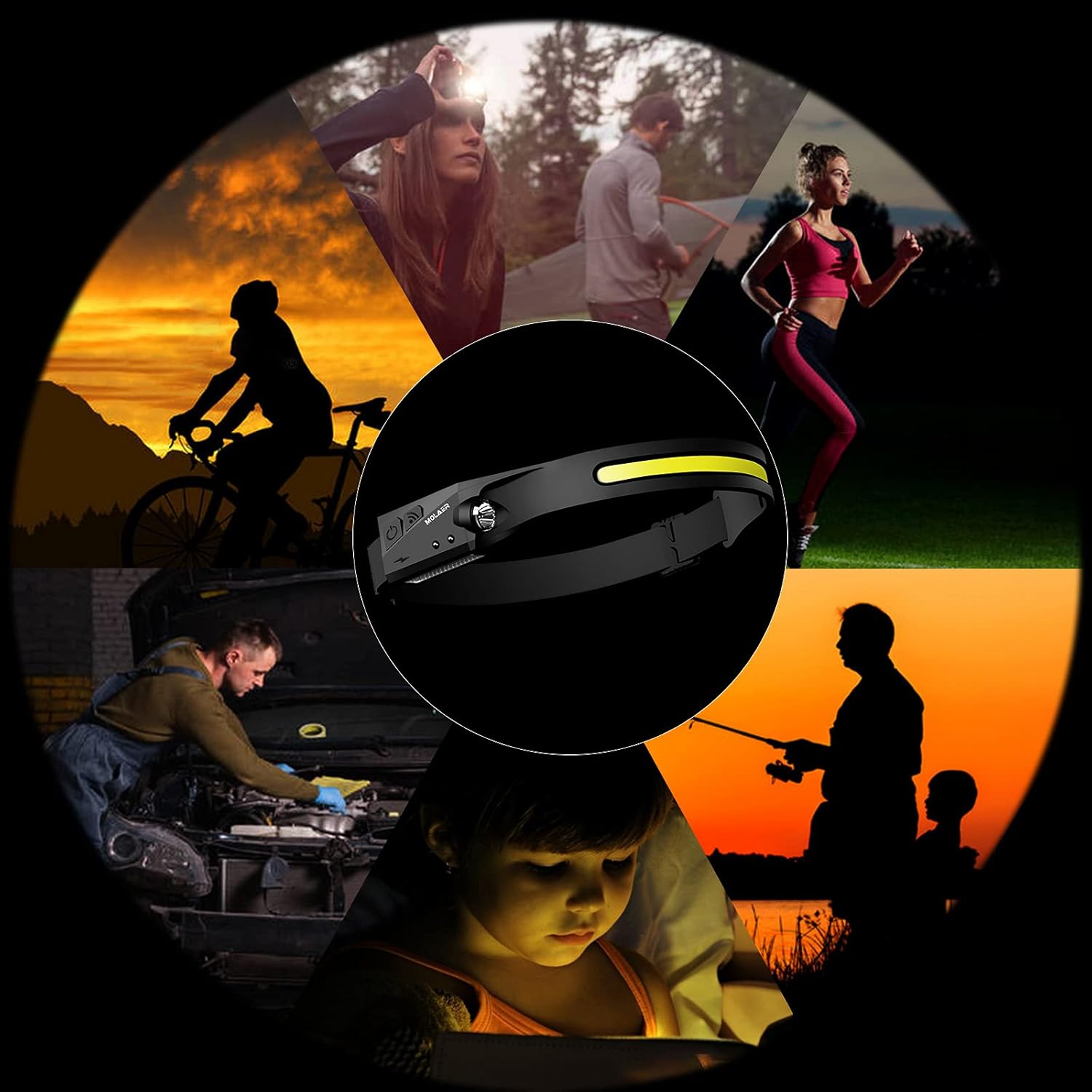 【5 Light Modes】 The headlamp has 5 light modes and is easy-to-operate. XPE LED Light: High (100%)/ Low (40%), COB Light: High (100%)/ Low (40%). In any mode, press the power switch 2 seconds into the Flash Light mode. After selecting the lighting mode, activate the motion sensor, you can turn on or off the headlamp by waving your hand.