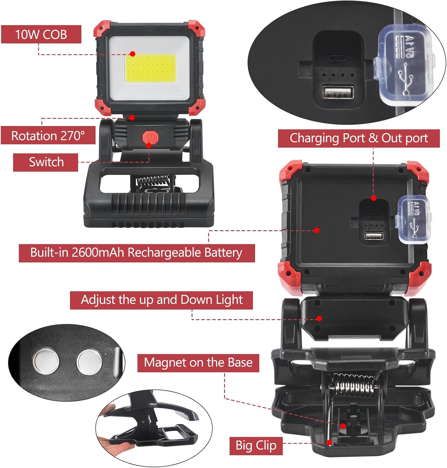LED Rechargeable Work Light with Clamp, 2100LM Super Bright COB Magnetic Work Light with 3 Light Modes, 270° & 180° Rotation, Waterproof, Perfect for BBQ, Jobsite, Workshop, Car Repairing