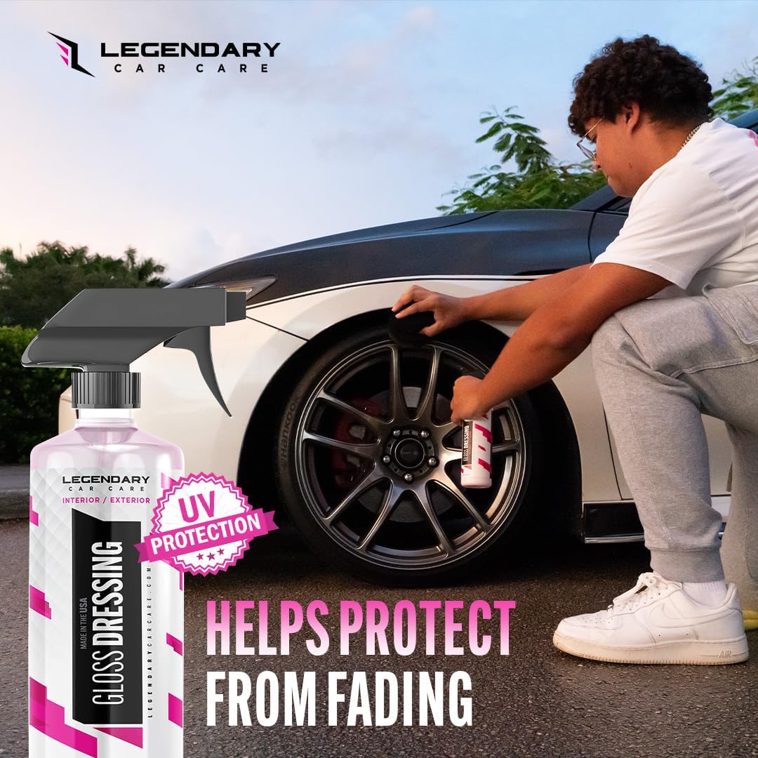 Legendary Gloss Dressing with Applicator 16oz – Tire Shine Spray & Plastic Restorer – Water Based & Non-Greasy Interior/Exterior Detailing Spray – Trim, Rubber, Vinyl & Plastic Restorer for Cars