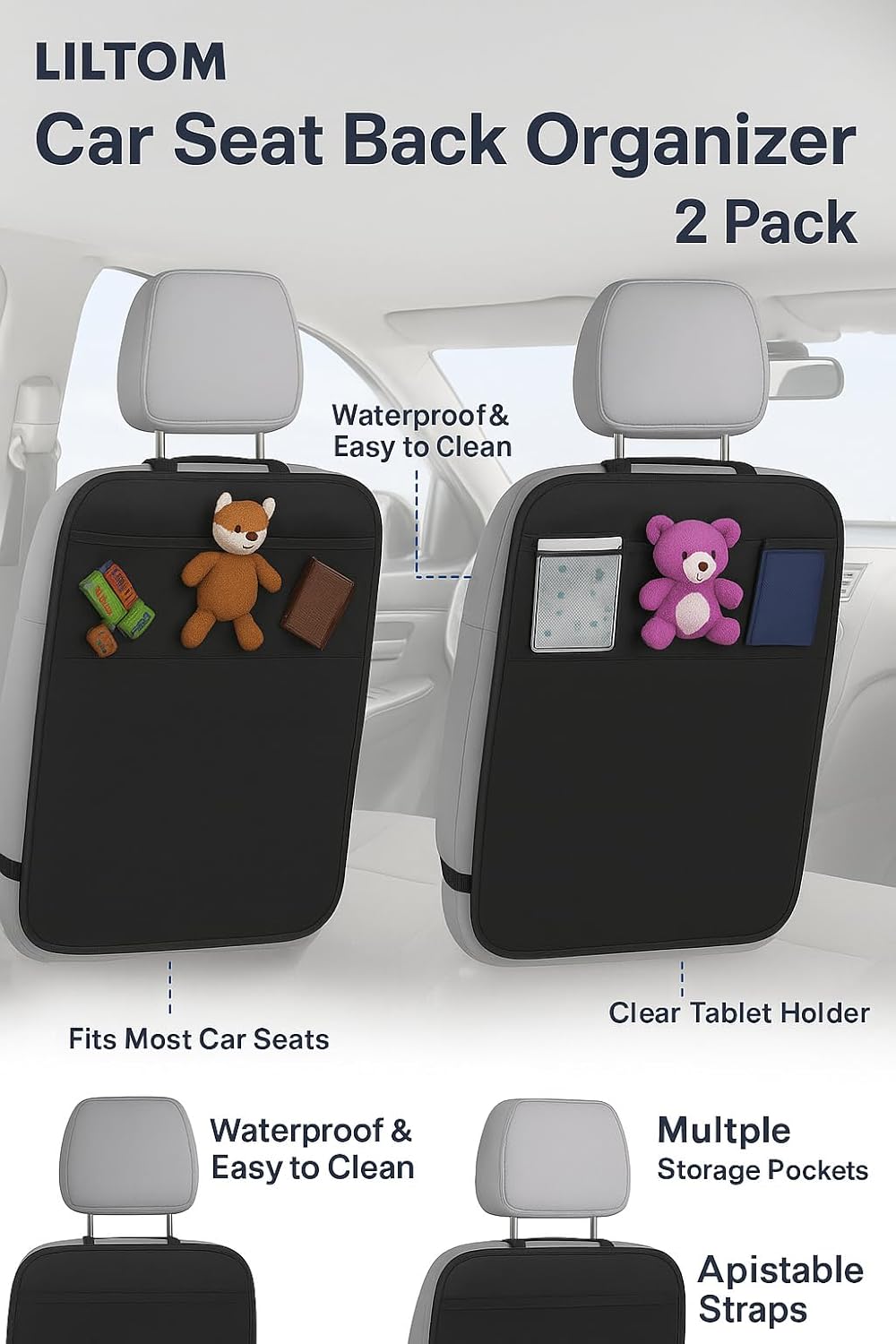 Protect your car’s interior with LILTOM’s premium back seat kick mats and organizers. These extra-large 19″x27″ protectors offer full coverage against scuffs, dirt, and damage from restless feet. Each mat features three deep storage pockets perfect for keeping kids’ essentials within easy reach during road trips. The waterproof design makes cleanup a breeze – simply wipe clean when needed. Secure fit is guaranteed with anti-slip straps at both top and bottom, while the universal design works perfectly in cars, SUVs, trucks, and minivans. This 2-pack provides complete protection for both front seats, helping maintain your vehicle’s value while keeping everything organized. The durable construction stands up to daily use, making these kick mats a practical addition to any family vehicle.