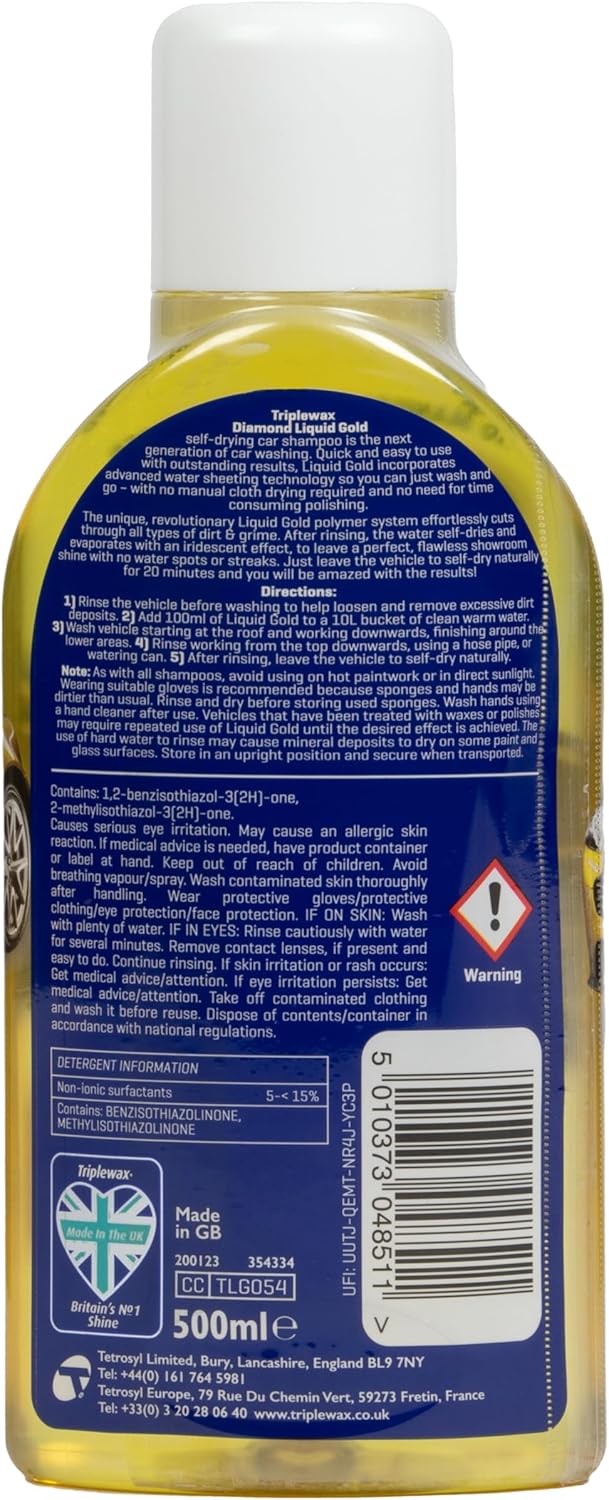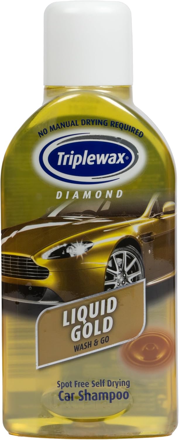 Wash your car faster and smarter with Triplewax Liquid Gold Self-Drying Car Shampoo – the next generation of car care. Engineered with advanced water-sheeting technology, this premium shampoo lets you simply wash, rinse, and go — no towel drying, no extra polishing, just a flawless shine in less time. The revolutionary Liquid Gold polymer system effortlessly breaks down dirt, road film, and grime while protecting your paintwork. As you rinse, water sheets off and evaporates naturally, leaving behind a streak-free, showroom-quality finish with a brilliant iridescent shine. Perfect for busy drivers and weekend detailers alike, Triplewax Liquid Gold saves you time while delivering professional-grade results at home.