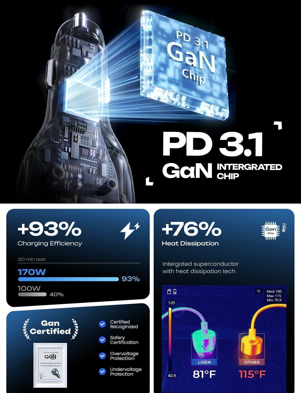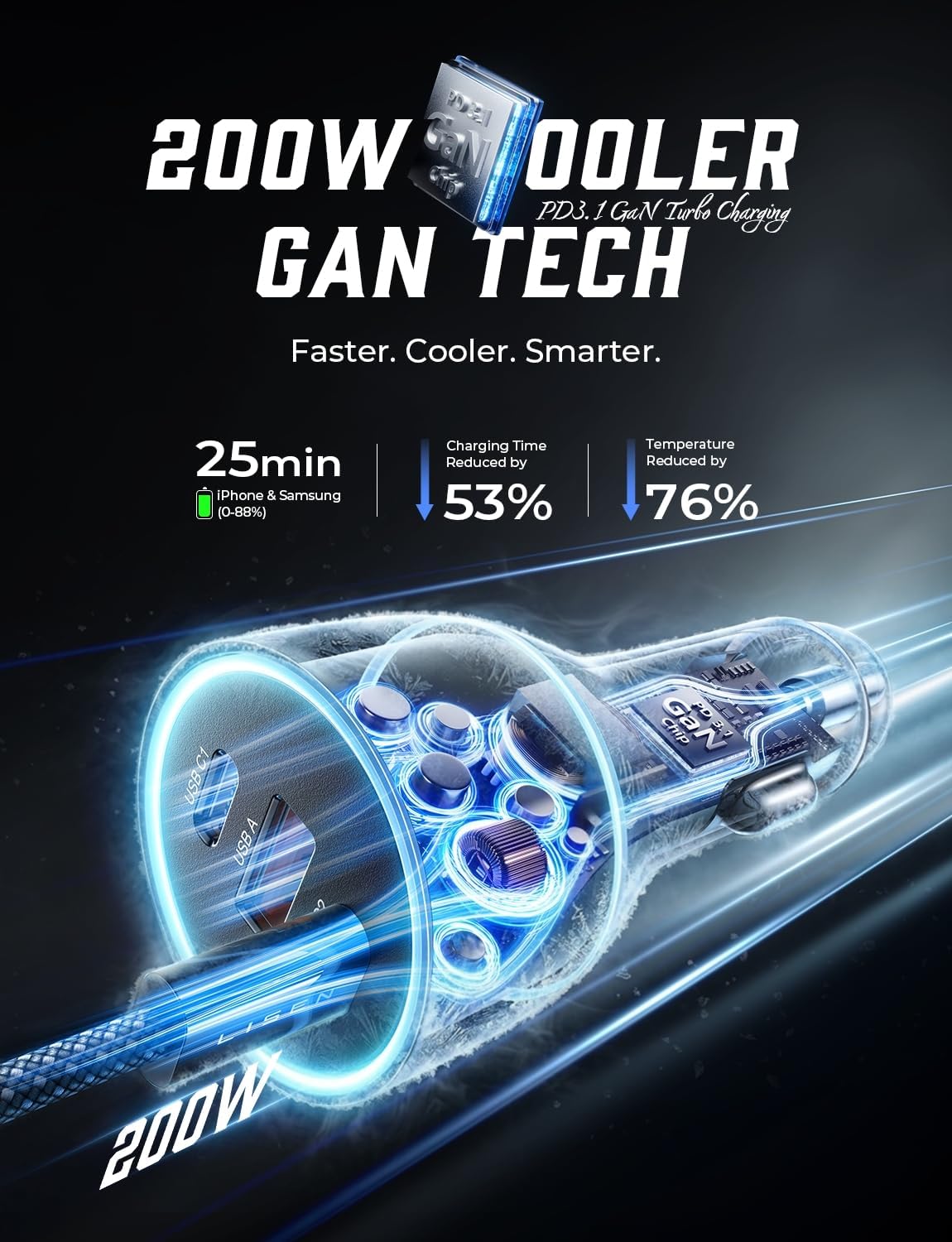【Advanced GaN Tech & Full-Metal Body】Built with next-generation GaN technology, this fast car charger operates with higher efficiency and generates less heat. Housed in a robust full-metal body for superior durability and heat dissipation, this car charger ensures reliable and safe performance on every journey.