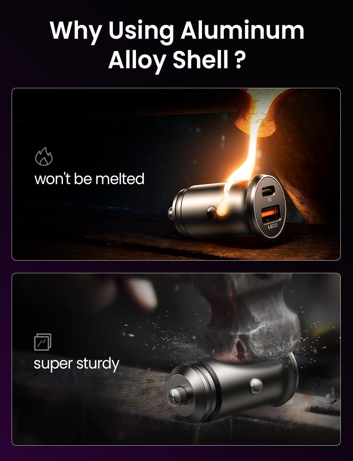 🔹 ALL-ALUMINUM SHELL, WON’T MELT: Built with a solid aluminum alloy body, this 12V car charger USB C ensures 15% better heat dissipation than plastic chargers — no melting, no overheating, and no burning smell. The sleek metallic finish elevates your car interior while providing unmatched durability. Ideal for car, truck, SUV, and RV use.
