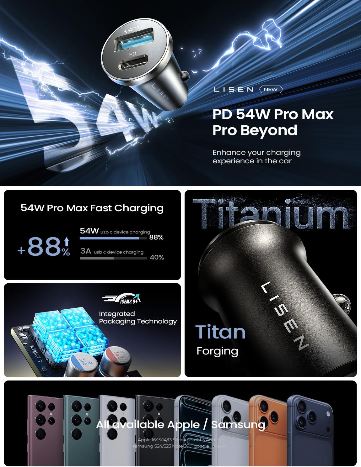 🔹 69W DUAL FAST CHARGING PORT: The LISEN fast car charger USB C adapter delivers a total of 54W high-speed power — PD 36W (Max) + PPS 33W (Max) — for iPhone 17 / 16 / 15 / 14 / 13 / 12 / Air, Samsung Galaxy S25 / 24 / S23 / S22 / S21 / Note 20 / S20 / A series, and all USB-C & USB-A devices. Perfect car charger for iPhone, Android, tablet, GPS, dashcam, and more. Fits all standard 12V/24V cigarette lighter sockets. [NOTE:] To ensure safe and stable performance, only one port provides maximum fast charging at a time