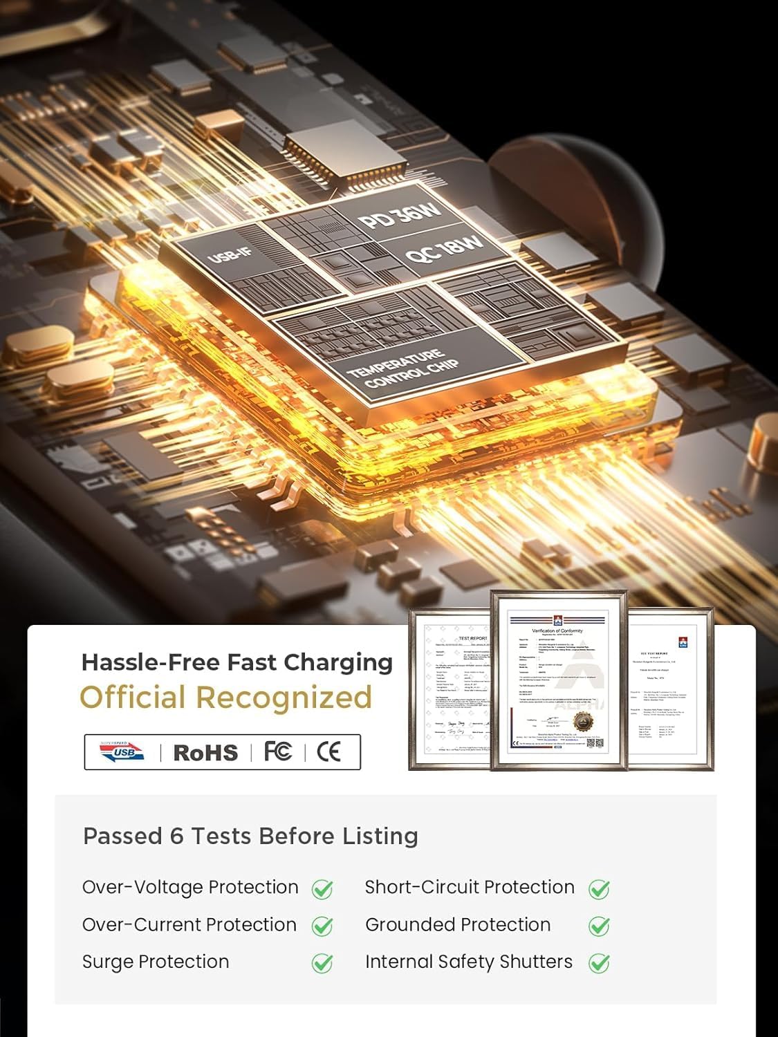 🔹 ADVANCED SAFETY CHIP & CERTIFIED PROTECTION: Equipped with Smart Power IC, certified by UL, CE, FCC, and RoHS, this car charger fast charging USB C adapter automatically detects and adjusts current to prevent over-voltage, short-circuit, and overheat. Constructed with V-0 flame-retardant PC + aluminum alloy, safe for continuous daily use in all climates.