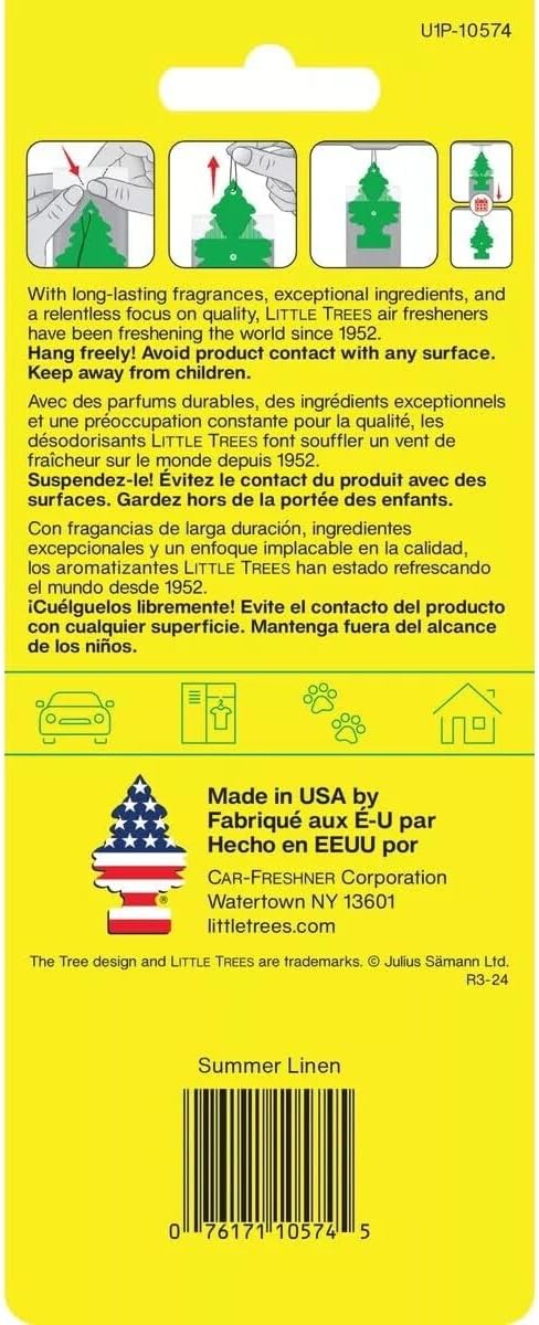 Add a little fragrance to your life with the world-famous Little Trees air fresheners. Summer Linen; Bright sunshine mingles with warm breezes, capturing the essence of sun-soaked linen. Like all Little Trees fragrances, it’s high-quality, strong and long-lasting. Hang it in your car, home or office.