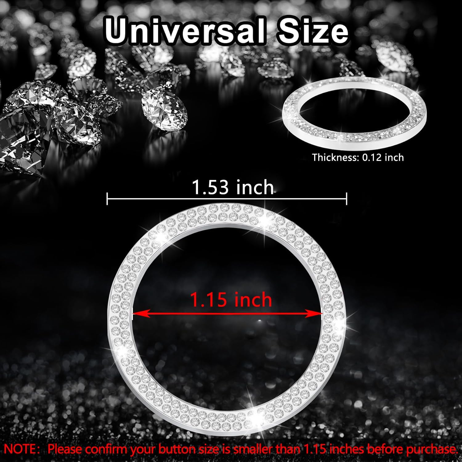 【Universal Size】Outer diameter: 1.53 inch, inner diameter: 1.15 inch, thickness: 0.12 inch.Fits most cars, SUVs, and trucks with a round engine start/stop button smaller than 1.15 inch. NOTE: Please confirm that your button size is smaller than 1.15 inch before purchase.