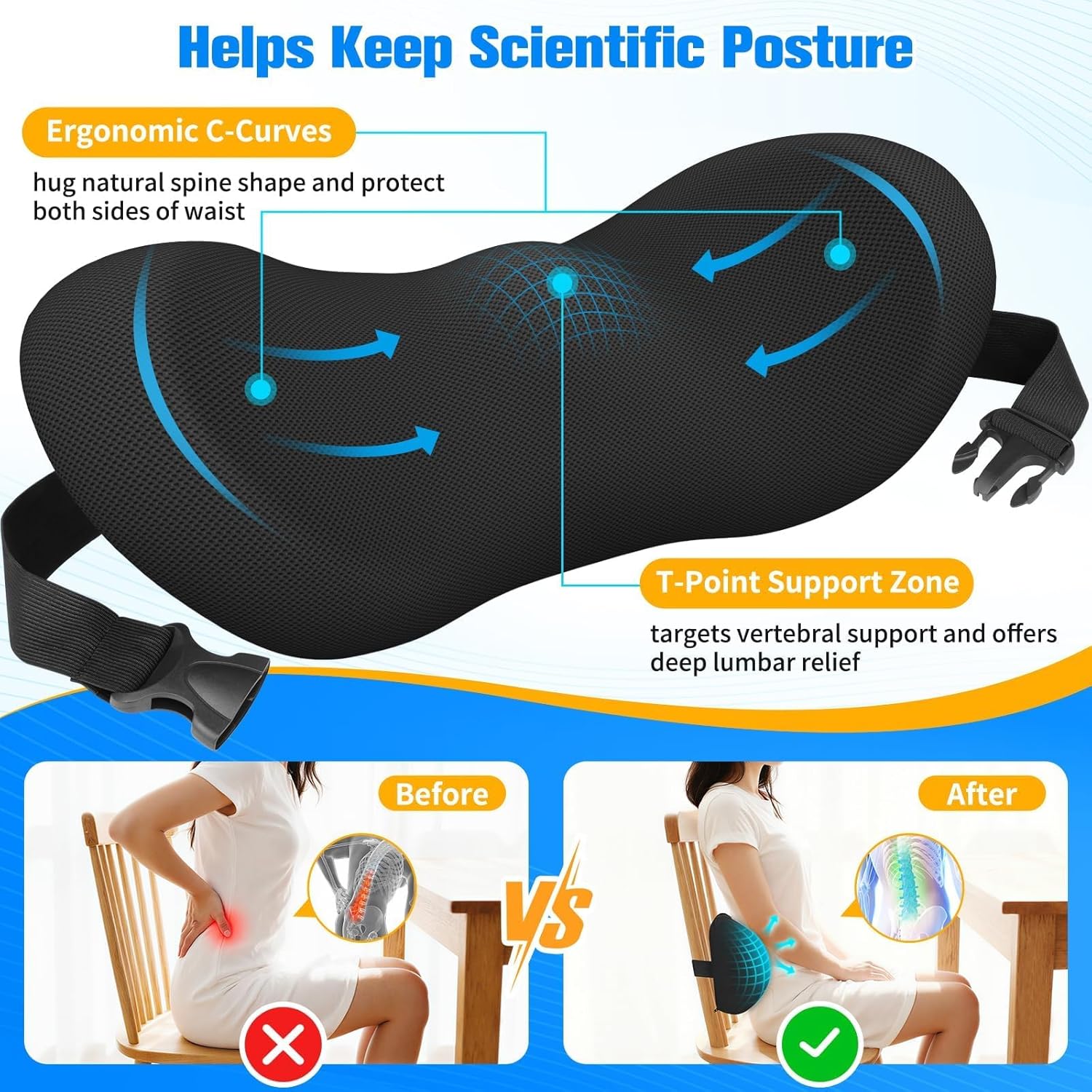 Lumbar Support Pillow for Office Chair – Memory Foam Lumbar Pillow with Detachable Strap & Breathable Cover, Ergonomic Back Support for Office Chair, Car Seat Cushion, Bed Rest (Black)