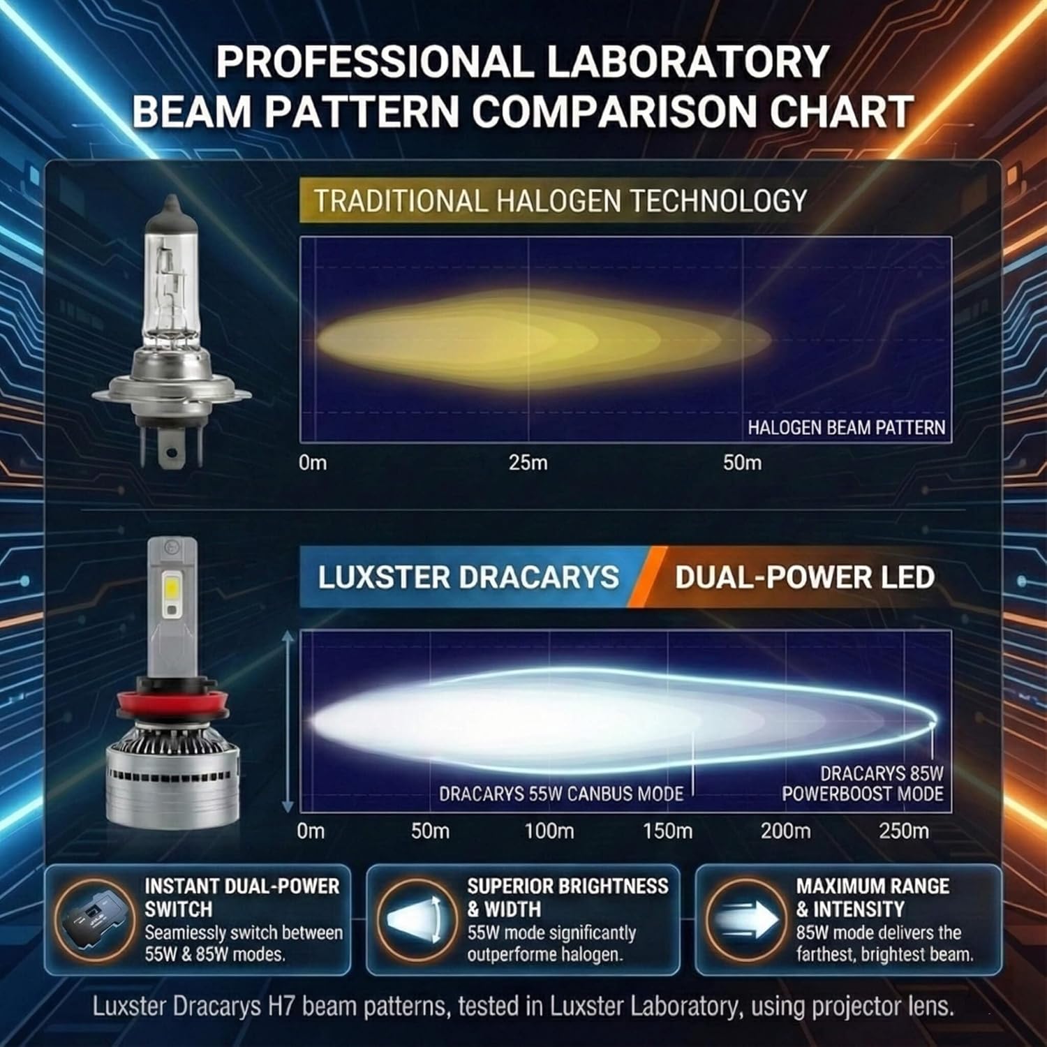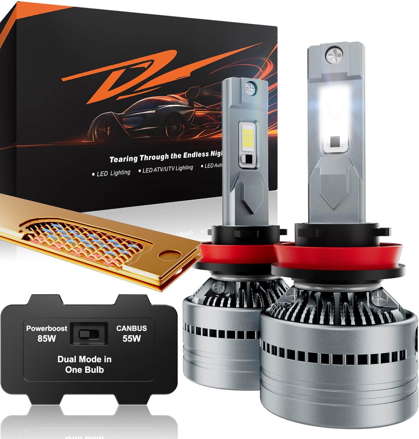 Switch seamlessly between 55W CANBUS Mode (60000LM | 5X halogen) for city-safe efficiency and 85W PowerBoost (100000LM) for extreme darkness.
