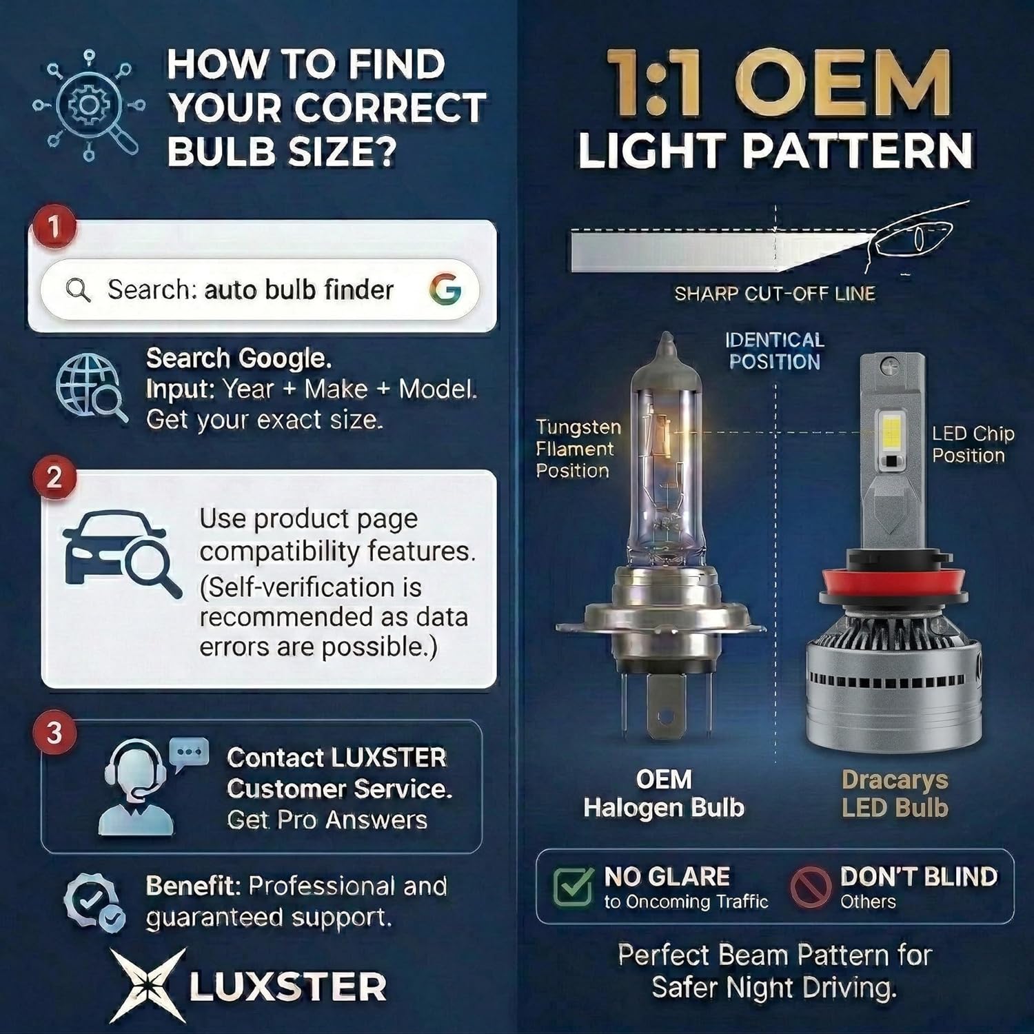 Luminous Flux 55W: 60,000 LM – Delivers 6 times the brightness of halogen, perfectly meeting daily and rainy/foggy weather needs for a crystal-clear view. 85W: 100,000 LM – Unleashes a stunning 10 times the luminous flux of halogen, designed for extreme darkness and off-road exploration to conquer the endless night. Core Cooling Vapor Chamber – Leveraging high-end graphics card cooling tech, with 20X the thermal conductivity of copper tubes, achieving revolutionary chip temperature control, guaranteeing performance and longevity at the source. Chip Temp 55W: 194°F; 85W: 230°F – Both significantly lower than the 284°F industry risk threshold, ensuring the LED chip always operates at peak efficiency, fundamentally preventing lumen depreciation from overheating. Beam Control 360° Rotatable Collar – Allows for tool-free beam angle fine-tuning, precisely matching the original vehicle’s reflectors to eliminate scatter and glare, promoting responsible driving. Lifespan 100,000 Hours – *Based on innovative low-temperature operation. Assuming 8 hours of use per night, it provides up to 34 years of service, representing a “once-and-done” investment.* Installation Plug-and-Play & Tool-Free Beam Adjustment – Direct halogen replacement. No need to remove the bumper or battery(for most of vehicles). The 360° collar allows perfect beam alignment in seconds, saving you time and professional installation costs. Light Cut-off Line Sharply Defined & SAE J2590 Compliant – Projects a crisp, clean cut-off line that maximizes light on the road while minimizing scatter and glare for oncoming traffic. Drive brighter and safer, without being a nuisance. Compatibility CANBUS Ready for 99% of Vehicles – 55W mode features built-in anti-flicker modules and resistors, preventing hyper-flash or error messages on your dashboard. Works seamlessly with most modern computer-controlled vehicles.