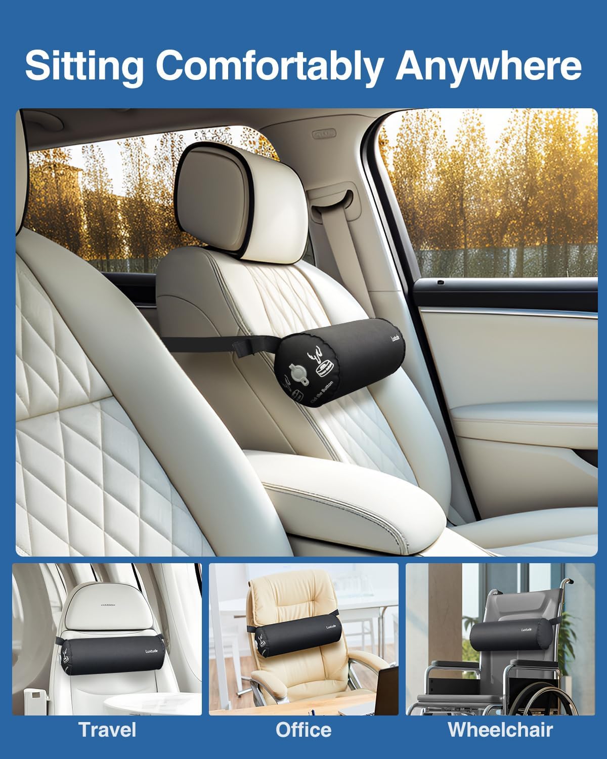 Supportive, comfortable lumbar pillow that is easily adjustable and perfect for travel. This Luxtude Inflatable Lumbar Pillow meets all of my needs. Lumbar support prevents my sciatic pain.The cylindrical shape and size nest comfortably in the sway of my back, offering support, whether in the car, my recliner, a dining chair, or out traveling. I love how easy and quick the pillow can be inflated and adjusted in fullness, as needed. The fabric is soft and feels smooth without rough edges. The materials and stitching are of nice quality and durable. I also love that the pillow deflates completely and rolls up compactly for travel or storage. I initially thought the waist strap was goofy, but I’ve come to love wearing it around the house as I move from chair to chair. Plus, I can wear it onto the plane without worry that I’ll forget it when we debark.On my first attempts to inflate the pillow, I could not figure out how to get the button to seal. Air kept escaping whether the push button was up or down. After many attempts, I finally figured out that the button does not have a tight seal in either the up or down position! It is the cap that needs to be snugly plugged that keeps the air from leaking out. The cap needs to be uniformly pressed into the hole for that airtight seal. Now, the pillow holds air just fine. For the convenience of a pillow that can be used in a variety of settings and chairs, and also deflates down to a compact size, and is easily adjusted to one’s comfort level, this is a great value at a very reasonable price.