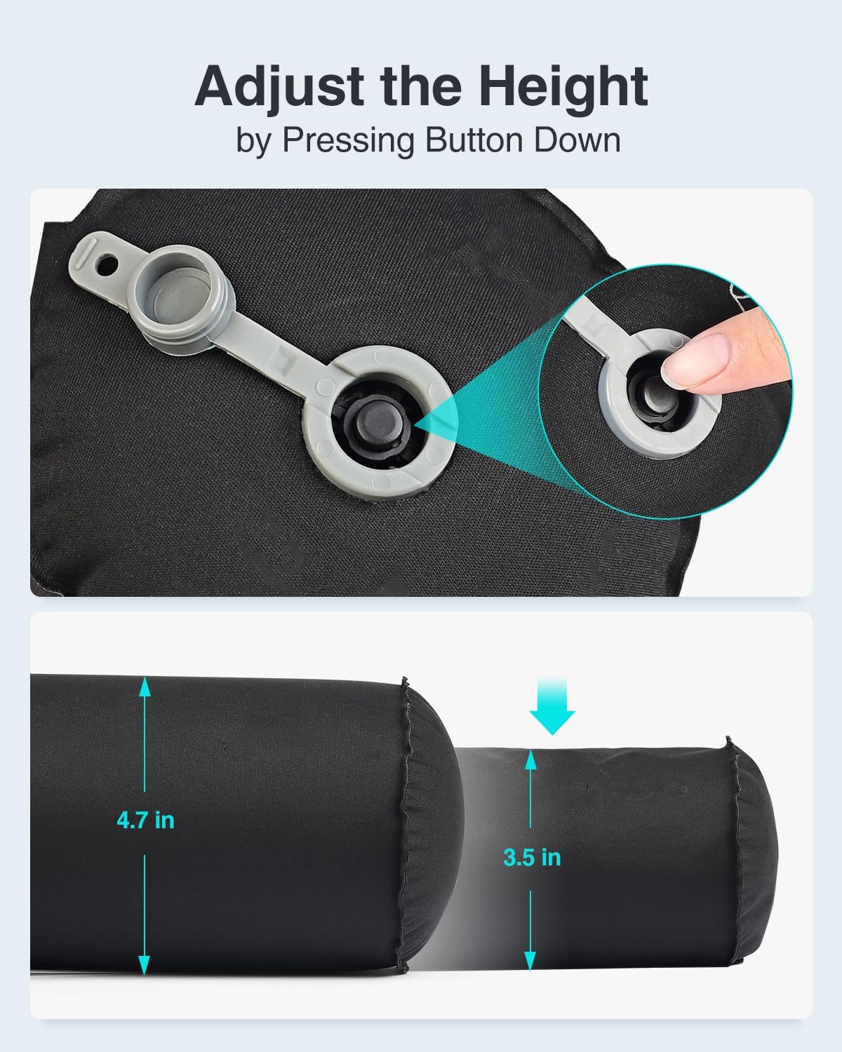Adjust the Firmness: Our inflatable travel pillow uses the Press Type air valve, it will naturally inflate to an unsaturated state in 1~2 minutes by pressing the button, and its inflatable design allows you to customize the firmness to your desired level, this ensures that you get the perfect amount of support and comfort for your specific needs.