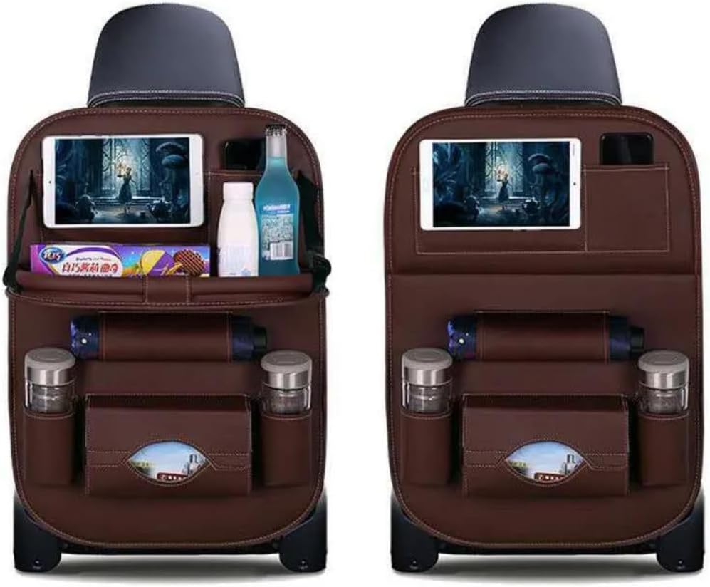 🧠 Multifunctional Design: Keep your car neat and tidy — holds drinks, snacks, tissues, books, and tablets in one place. Perfect for long family trips or daily commutes. 💪 Premium PU Leather: Made of high-quality waterproof PU leather — durable, easy to clean, and adds a luxurious look to your car interior. 🍔 Foldable Dining Table: Built-in foldable tray table holds up to 2.5 kg — great for eating, reading, or holding a tablet for kids. 📱 Universal Fit: Adjustable straps make it compatible with most cars, SUVs, and trucks. Quick and secure installation in minutes. 🧴 Family Travel Essential: Ideal for parents with kids — keeps toys, bottles, and tissues organized and within reach.
