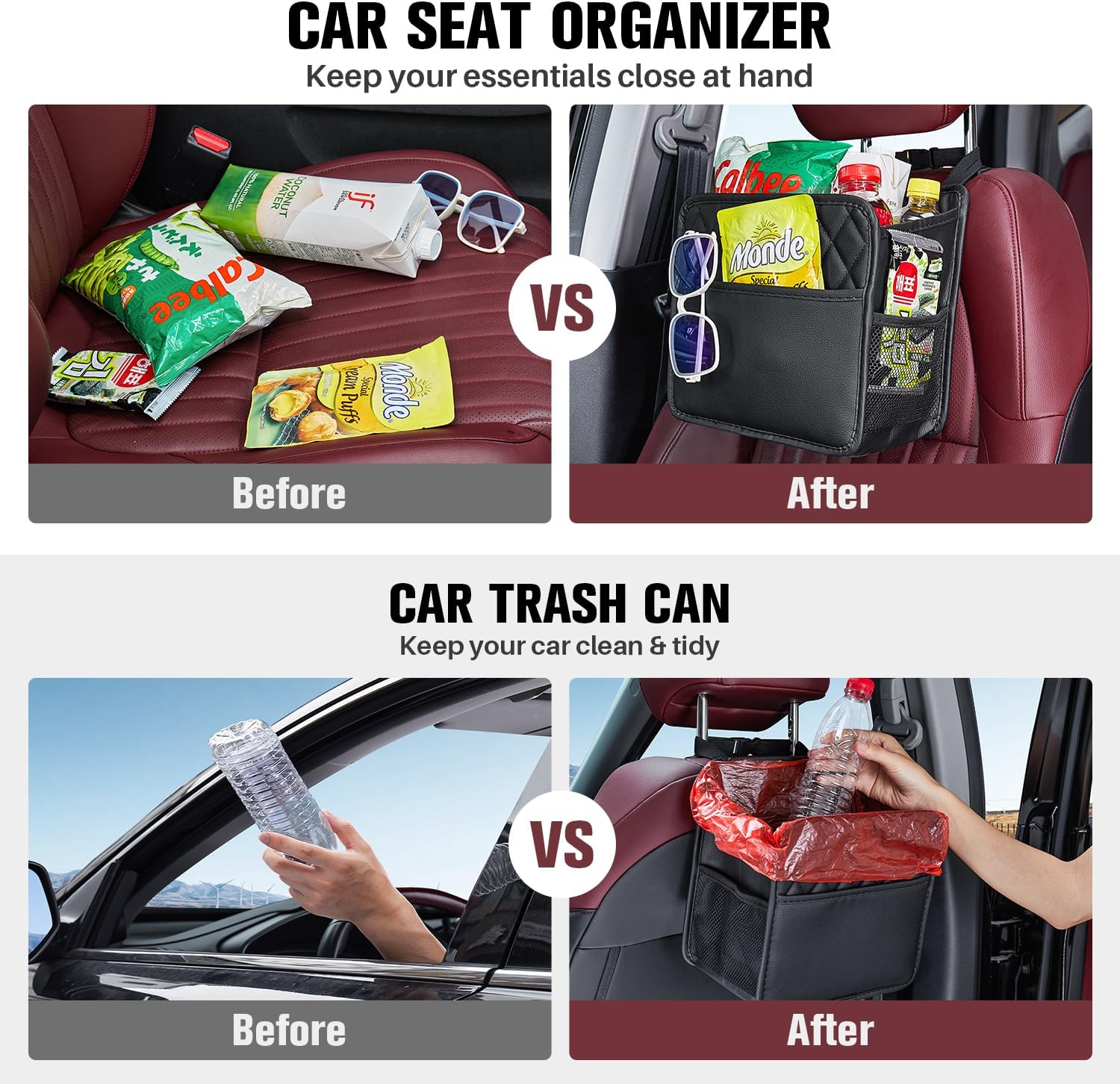 【Easy to Install】 The car backseat organizers is easy to in stall with 2 adjustable straps. Simply slip the straps over the headrest and adjust them to fit. The adjustable straps of the car seat organizer backseat will ensure a secure fit and prevent the car seat organizer from slipping down while driving. This car garbage can is worth having. This car organizers and storage is a must road trip essentials and car travel acccessories for kids, women and men