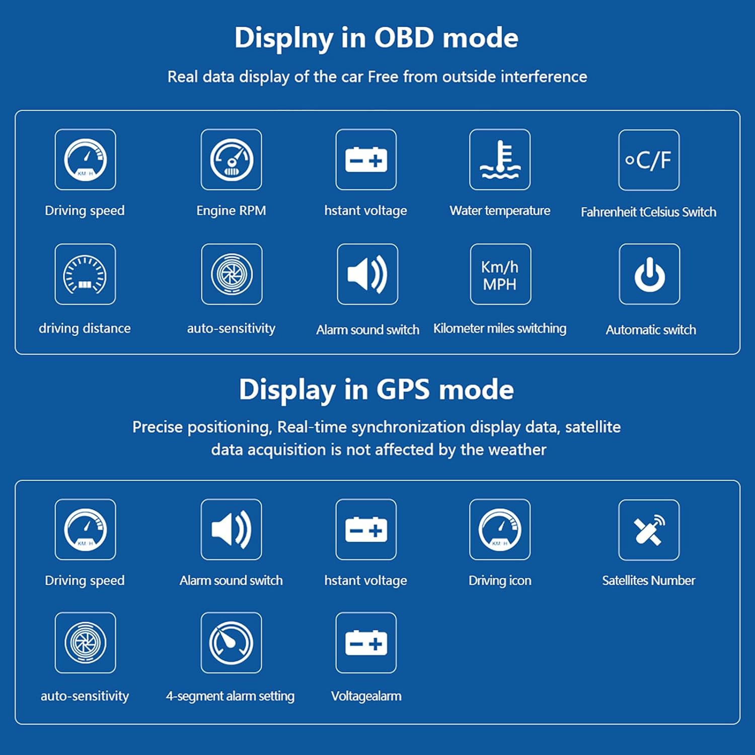 【Compatibility:】 The OBD mode of this product is only applicable to most gasoline vehicles after 2008, and the GPS mode is applicable to any car. OBD mode directly reads the original car data, while GPS mode requires searching for satellites to display the data. When your car does not comply with the OBD protocol, please switch to GPS mode within 5 seconds of starting up. OBD2 mode is not compatible with hybrid electric vehicle, diesel car, pickup truck, RV, computer modified car, it is recommended to use the GPS mode.If you are unsure if your car can use the product’s OBD mode, you can ask us.