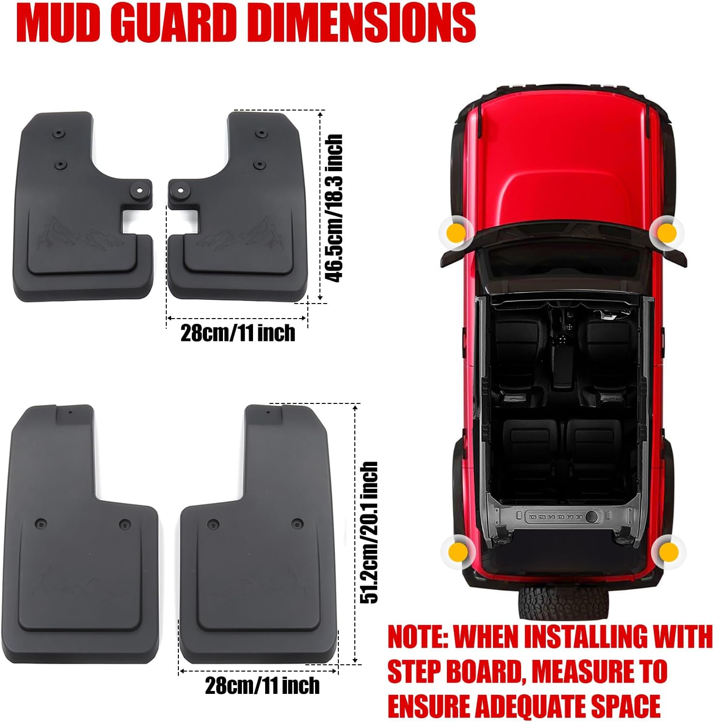 DIMENSION INFORMATION:Front Mudguard: 28cm (Width) × 46.5cm (Length),Rear Mudguard: 28cm (Width) × 51.2cm (Length).When Installing With Step Board, Measure To Ensure Adequate Space