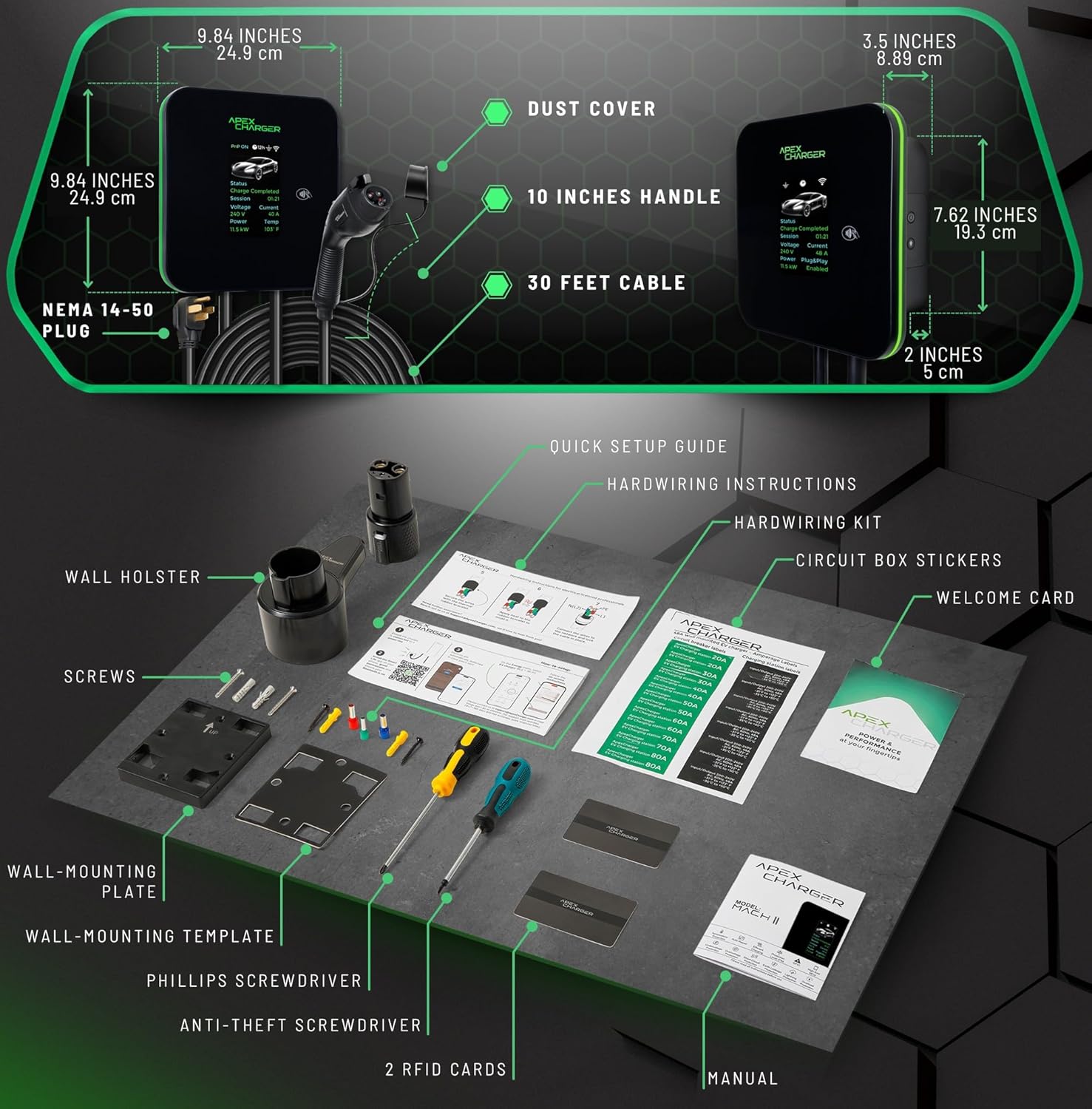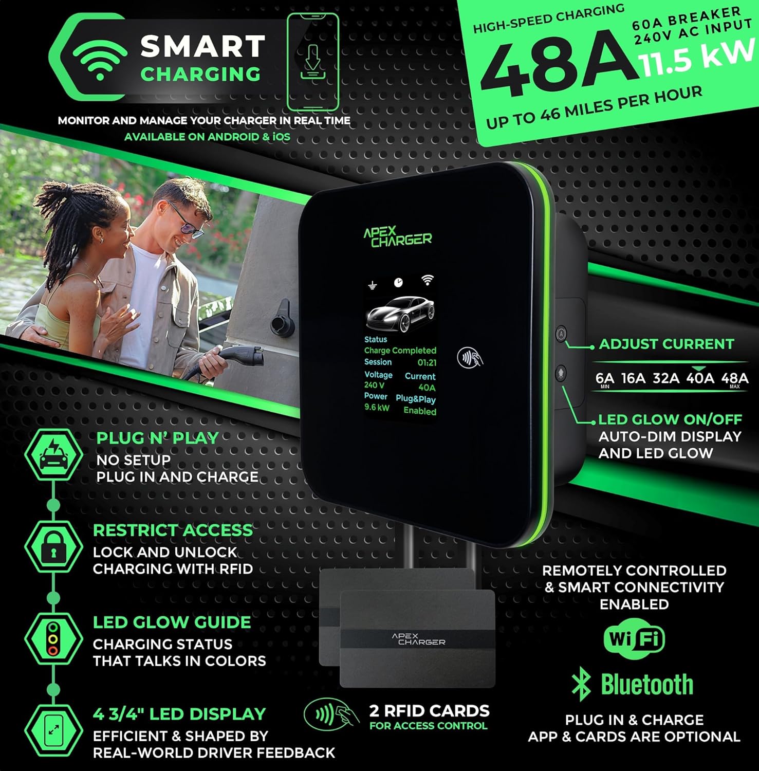 EV charger level 2: a fusion of utility upgrades: 240v & 11.5KW of power. Bluetooth & Wi-fi enabled, electric car charger, 2 RFID cards, the True Plug N’ Play function, mobile smart app, connectors holder, 4 3/4″ LED display panel with standby function for energy saving and the 24h Apex Charger post sales stellar customer support, all included