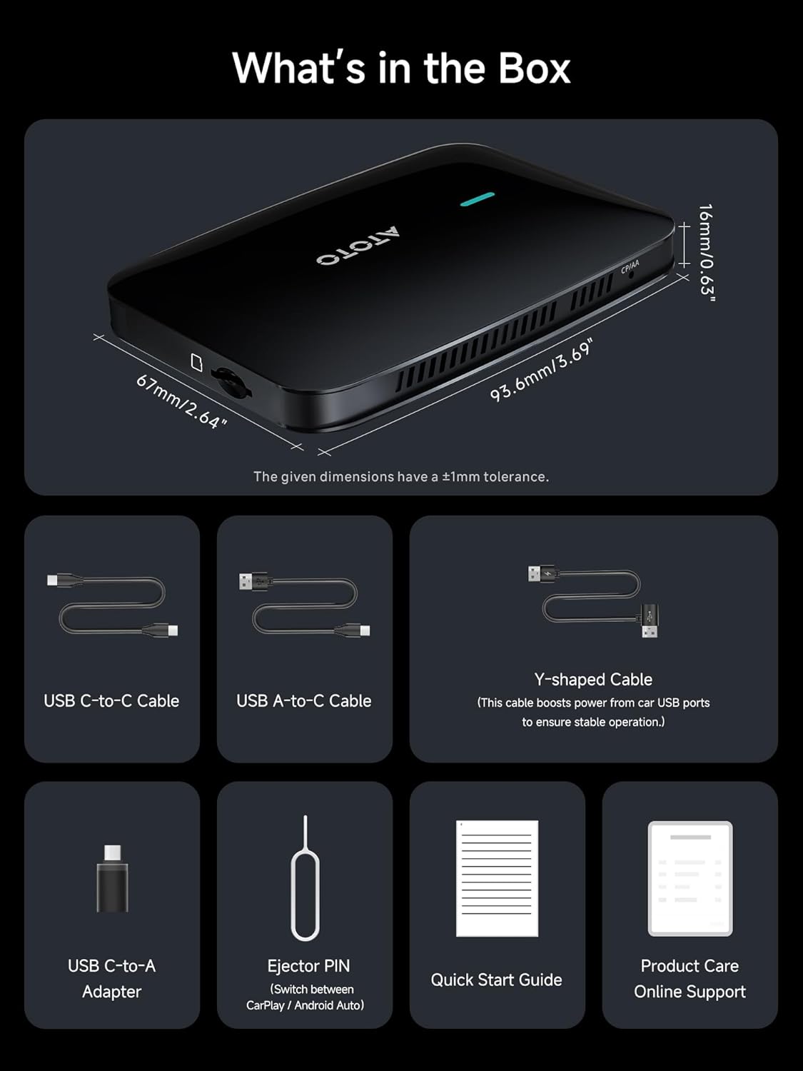 Complete Cable Kit + MYATOTO Warranty Support:Includes USB-A to C, USB-C to C, and a stability-boosting Y-cable for modern vehicles using wireless CarPlay adapter USB-C connections. Backed by MYATOTO’s extended care and responsive support—rewarding you with long-lasting confidence in your purchase.