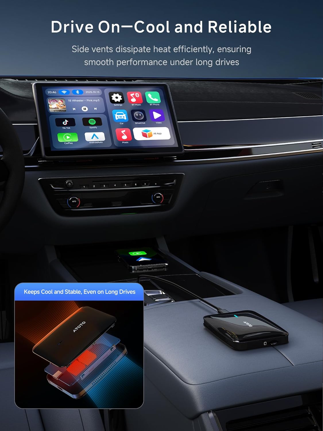 Designed for a Stable, Fluid Wireless Experience:Dual-WiFi channels maintain a stable wireless carplay adapter for android connection while powering online apps through MYATOTO’s internal system. This ensures navigation stays responsive while media loads smoothly without interruptions—giving you a sense of confidence that your tech won’t fail when you need it most.