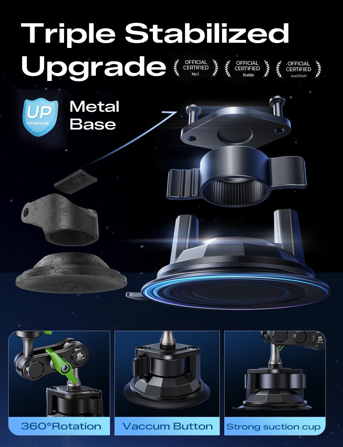 I’ve gone through more car phone mounts than I care to admit, and this MAGIC JOHN Car Phone Holder is easily one of the best I’ve used.The metal construction immediately stands out. It feels solid, well-machined, and far more durable than the typical plastic mounts that loosen or crack over time. Once mounted, it stays put—no shaking, slipping, or sagging, even on rough roads.The suction cup is extremely strong and holds securely to the windshield. After several days of driving, including bumps and temperature changes, it hasn’t budged at all. The 360° rotation is smooth and makes it easy to position the phone exactly where I want it without blocking my view.Phone placement and removal are quick and easy, and it holds my phone firmly without pressing buttons or interfering with charging. I’ve used it with different phones, and it works perfectly every time.Overall, this mount delivers excellent build quality, strong grip, and reliable performance. If you’re tired of flimsy car mounts and want something that actually lasts, this one is absolutely worth it. Highly recommended.