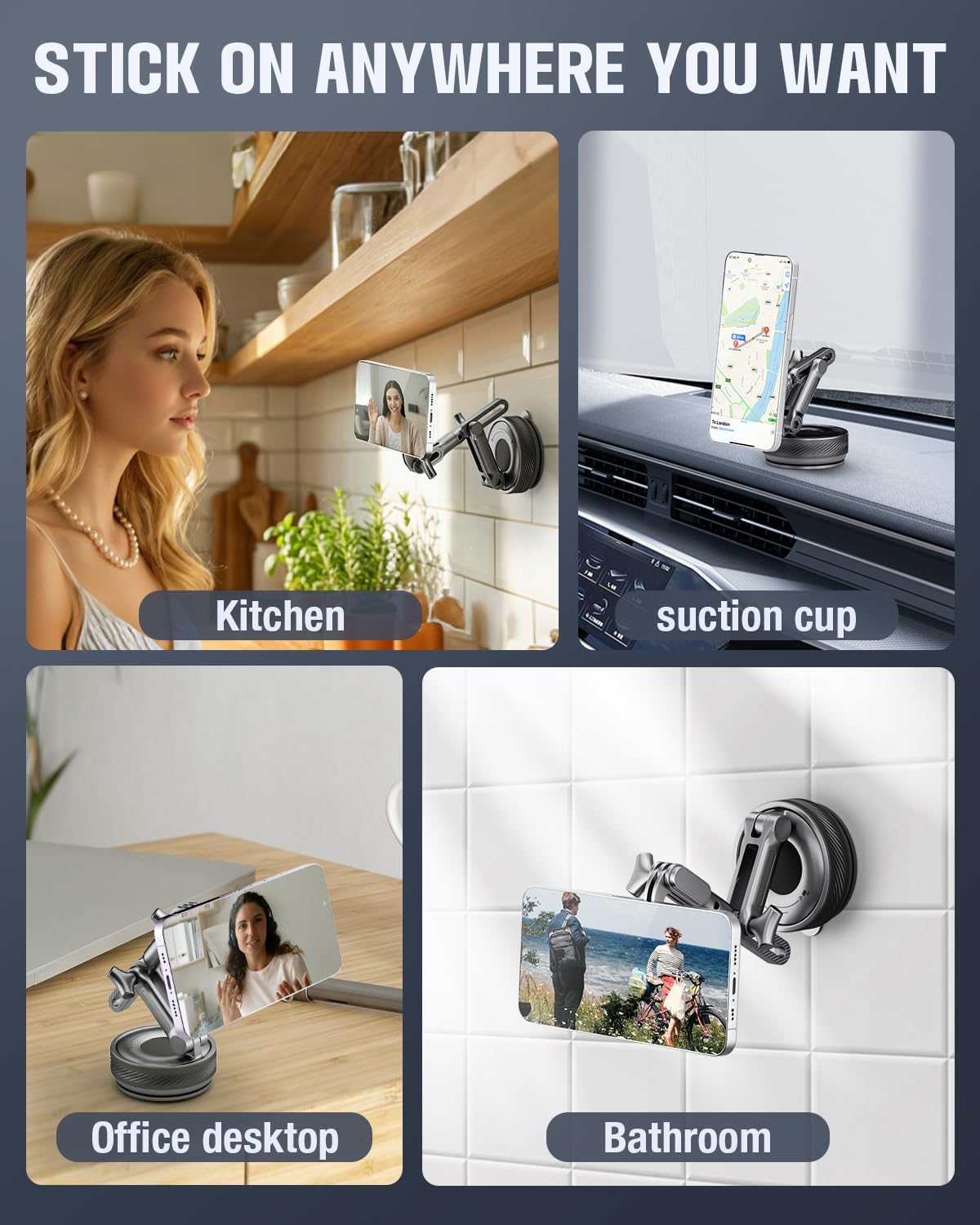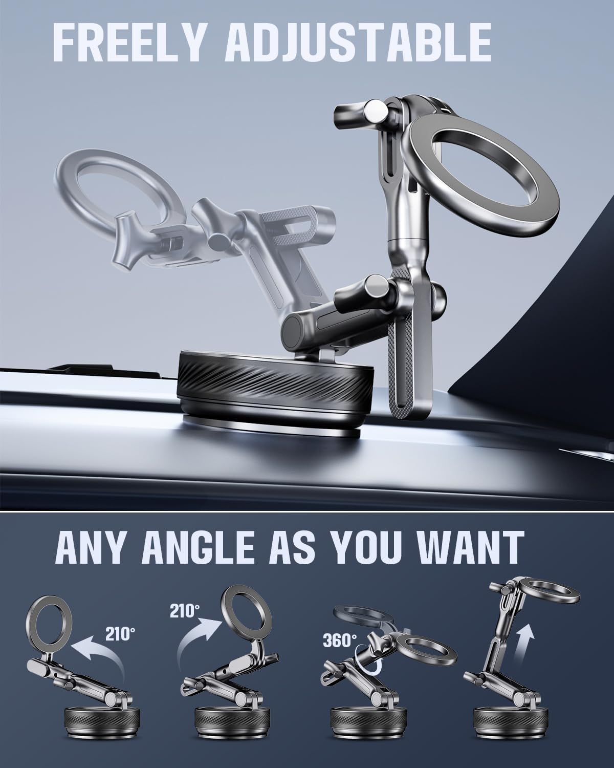 【360° Dual-Directional Adjustable Positioning】This vacuum-suction magnetic phone mount offers flexible angle adjustment. Unlike similar products, it also features adjustable length, making it ideal for both in-car navigation and home use while maintaining long-term stability.