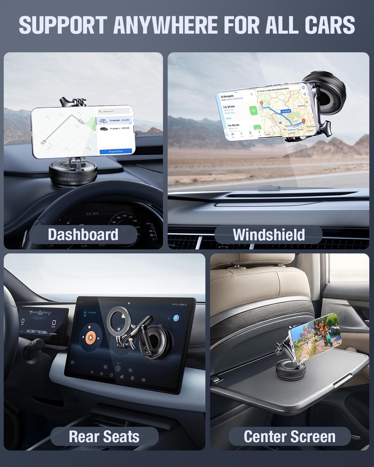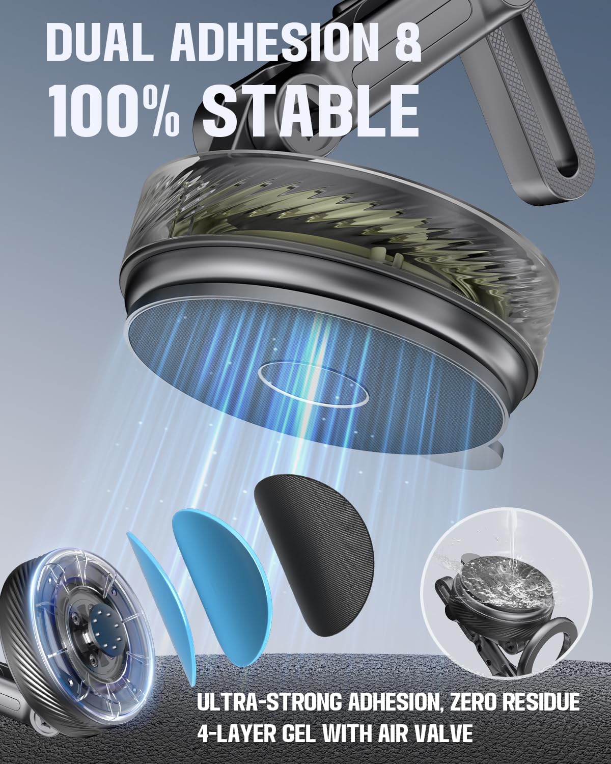 【Easy to Use Anytime】Our adjustable 360-degree rotating vacuum car phone mount features an upgraded four-layer nano-gel suction cup base with rotating vacuum sealing technology. Simply twist the knob to securely attach it to flat surfaces like leather dashboards, windshields, center consoles, or side windows. Its holding power is 80% stronger than traditional press-on mounts, staying rock-solid even on bumpy roads. Tip: If suction weakens, simply rinse with water to restore original adhesion.