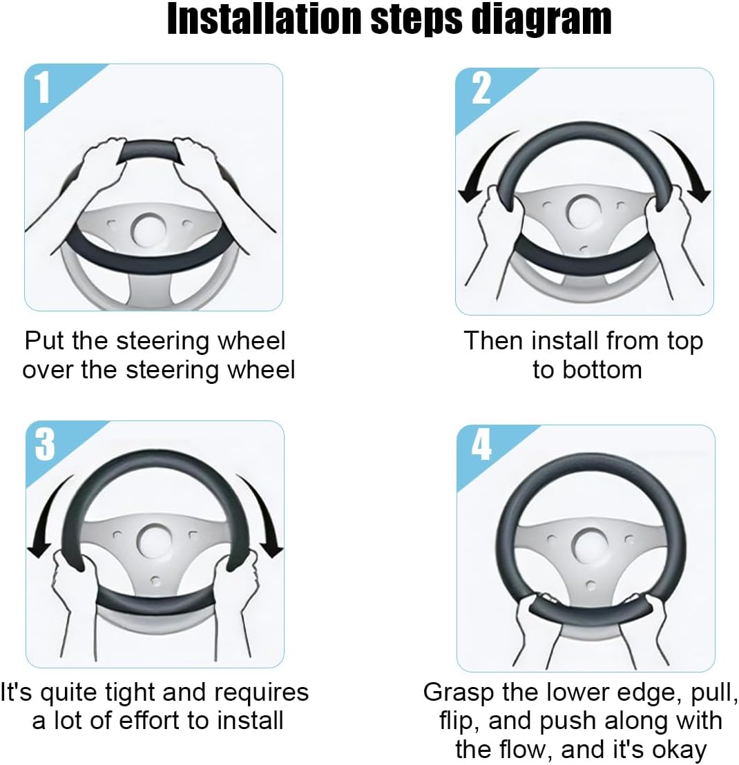 Easy Installation: This car steering wheel cover is easy to install without any tools. First you need to put the steering wheel cover on the steering wheel, and then install it from top to bottom, if it is tight, you need to install it vigorously, then buckle the lower edge, pull and push it to complete the installation. The whole process is easy and smooth, and the installation can be completed in a short time.