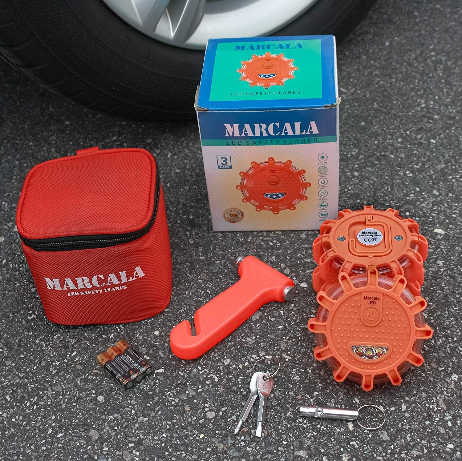 ✅ UNLIKE OTHER BRANDS Our roadside emergency kit with flares ARE DOT COMPLIANT. THE PERFECT GIFT FOR THE NEW DRIVER IN YOUR FAMILY. EACH CAR EMERGENCY KIT INCLUDES a gift-ready box, 3 roadside safety discs with 9 BATTERIES INSTALLED, carry-bag and multi-tool. ALL KITS INCLUDE BONUS BATTERIES, CAR SEATBELT CUTTER AND WHISTLE! A must-have for young drivers, friends and family.