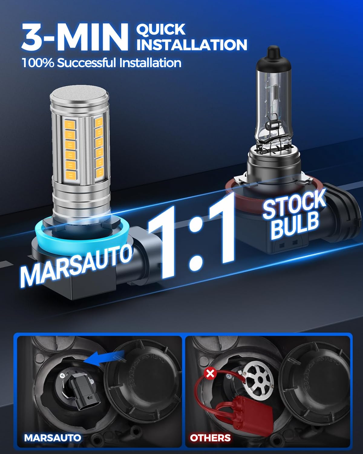 Fit for 99% Vehicle: Built-in intelligent upgraded IC driver, Can bus-ready, No Radio Interference, No Error, No Lights Flashing. Marsauto H11 Led Fog Light bulb is compatible with H11/H16/H8 or daytime running lights