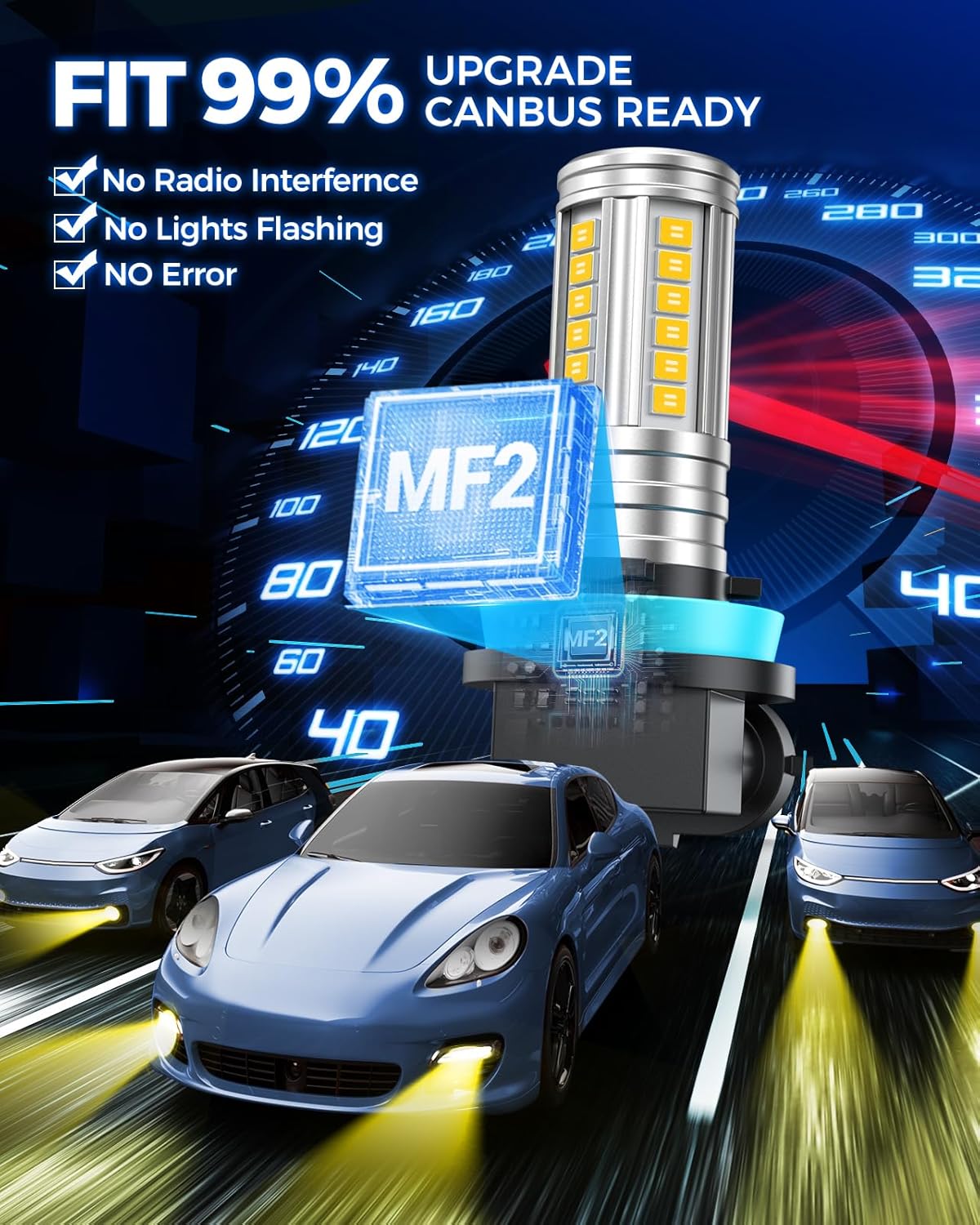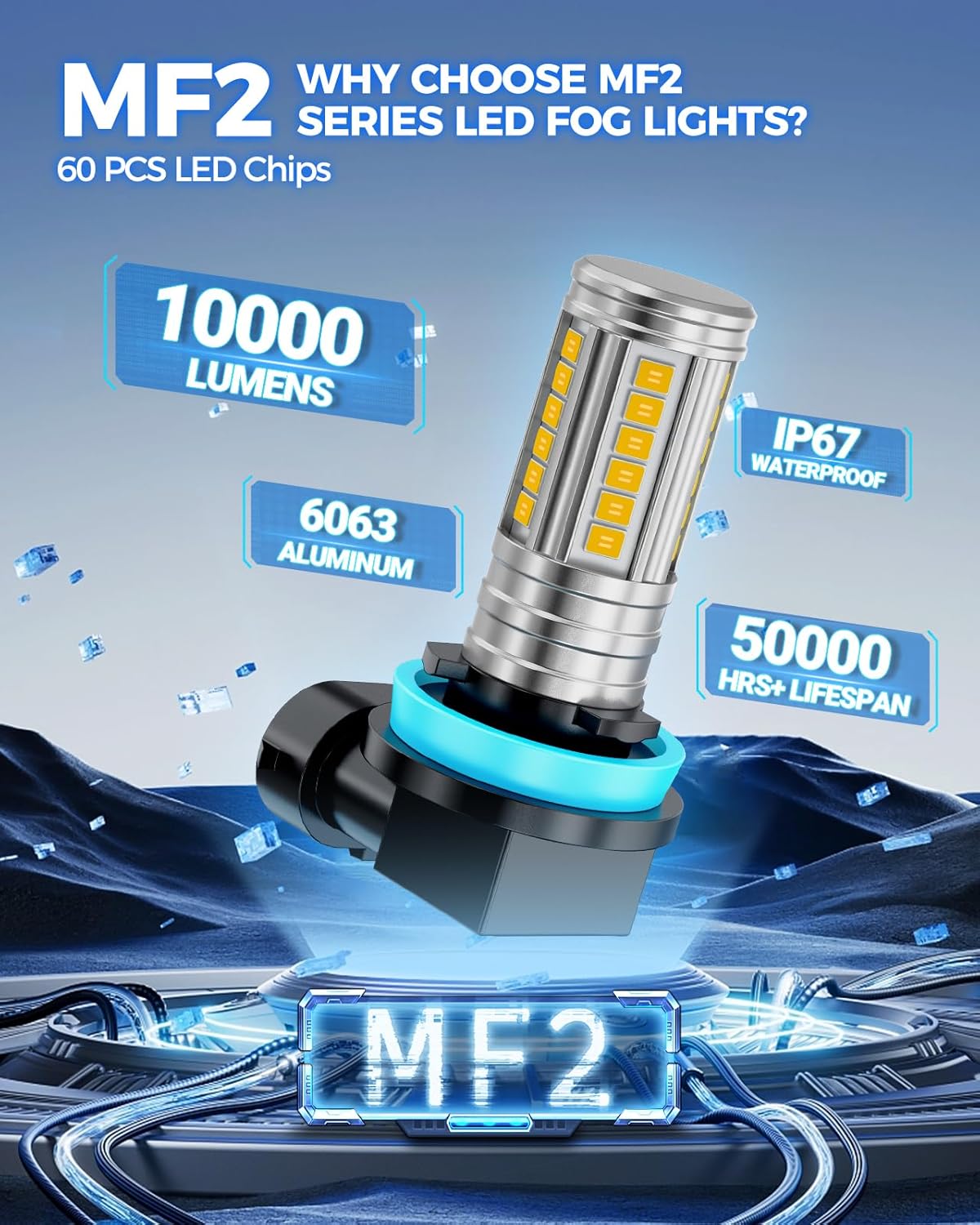 600% Penetrating Brightness: Equipped with 60 PCS premium CSP chips to deliver 12,000 LM consistent light output. 3000K yellow strong penetration ability, Equipped with MF2 series h11 led bulb yellow, you will easily cope with various bad weather conditions
