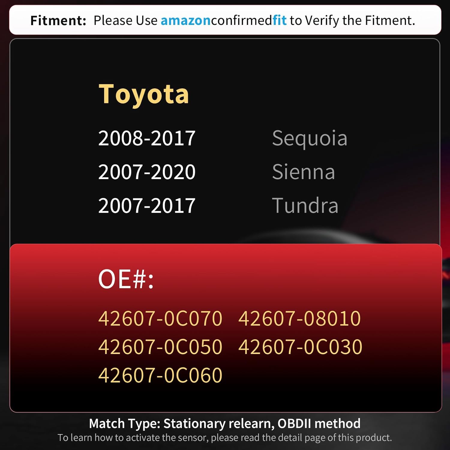 Replace OE Number: Marsflex TPMS sensors replace OE 42607-0C070, 42607-08010, 42607-0C030, 42607-0C050, 42607-0C060. Please use amazon confirmed fit to verify the fitment