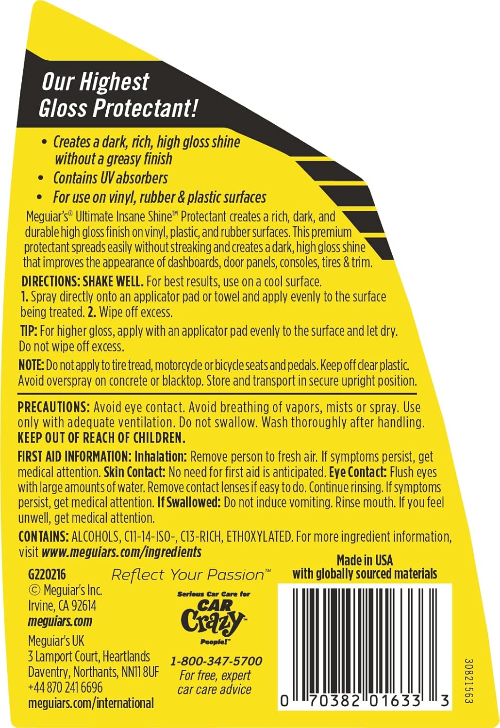 Meguiar’s Ultimate Insane Shine Protectant in the 16 oz spray bottle has truly exceeded my expectations. This product has proven to be exceptional in delivering an impressive shine and providing long-lasting protection for the surfaces in my vehicle.The shine it imparts is nothing short of remarkable. It leaves a glossy and radiant finish that enhances the appearance of both the interior and exterior surfaces of my car. Plastic, vinyl, and rubber surfaces look revitalized and appear as if they were brand new.The spray bottle design is highly user-friendly, allowing for easy and precise application. The product sprays a fine mist that evenly coats the surface, and a little goes a long way. It spreads effortlessly and dries quickly, leaving behind a smooth and non-greasy finish.The protectant properties of Meguiar’s Ultimate Insane Shine Protectant are top-notch. It effectively guards against UV rays, preventing fading, cracking, and discoloration of the treated surfaces. Additionally, it provides a layer of defense against dust, dirt, and other contaminants, making it easier to maintain a clean and pristine appearance.I have been thoroughly impressed with the longevity of the protection provided by this product. Even after several weeks of use, the shine remains intact, and the surfaces continue to repel dust and maintain their luster.Overall, Meguiar’s Ultimate Insane Shine Protectant in the 16 oz spray bottle is an outstanding product. Its ability to deliver an exceptional shine and long-lasting protection, combined with its user-friendly application, makes it a must-have for anyone looking to enhance and maintain the appearance of their vehicle. I highly recommend it without hesitation.