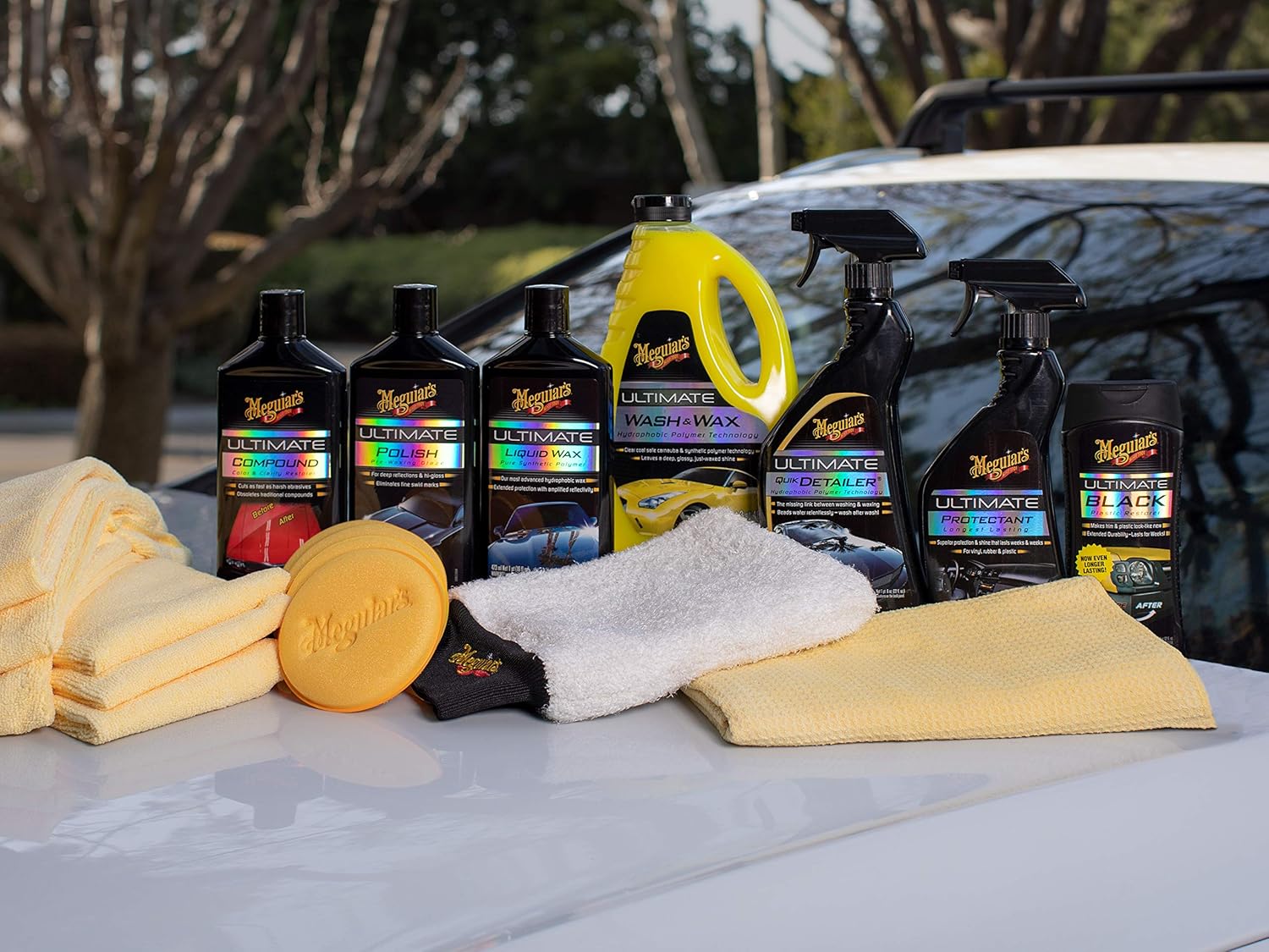 ULTIMATE WASH KIT: 19-piece car wash kit loaded with the quality Meguiar’s Ultimate products you need to keep your car’s exterior, interior, trim pieces and tires clean and protected