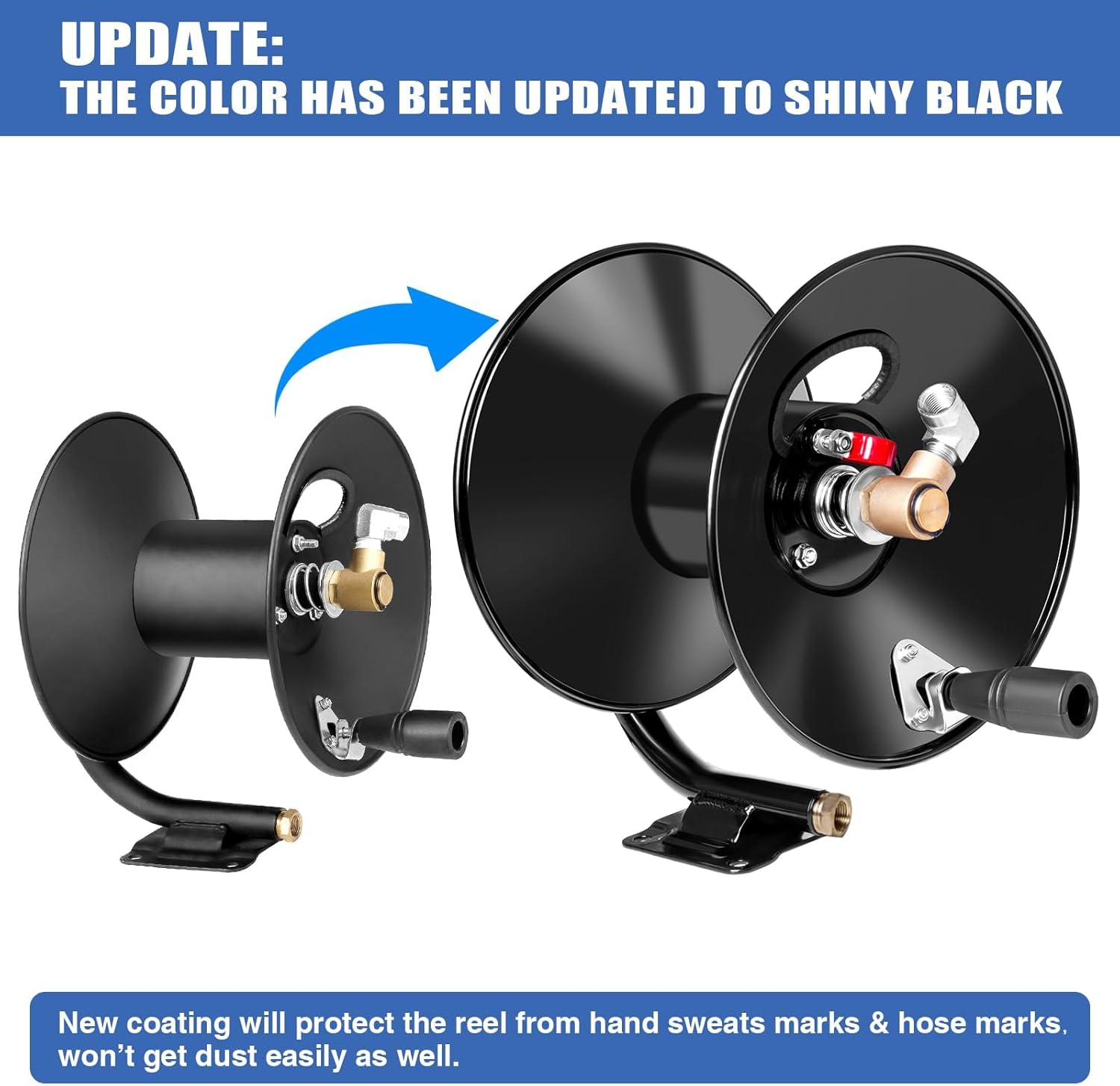 UPDATE: 1)The coating of the whole reel has been updated to shiny black, not matte black any more. The new coating will protect the reel from hand sweats marks & hose marks, won’t get dirty easily. 2)The blue whip hose’s color was changed, it is black now, this change won’t affect use. 3) This reel is also available for 65ft 1/4″ M22-14MM Hose, please use the attached adapters to convert the inlet and outlet. WARNING: NOT AVAILABLE FOR 1/4″ M22-15MM HOSE.