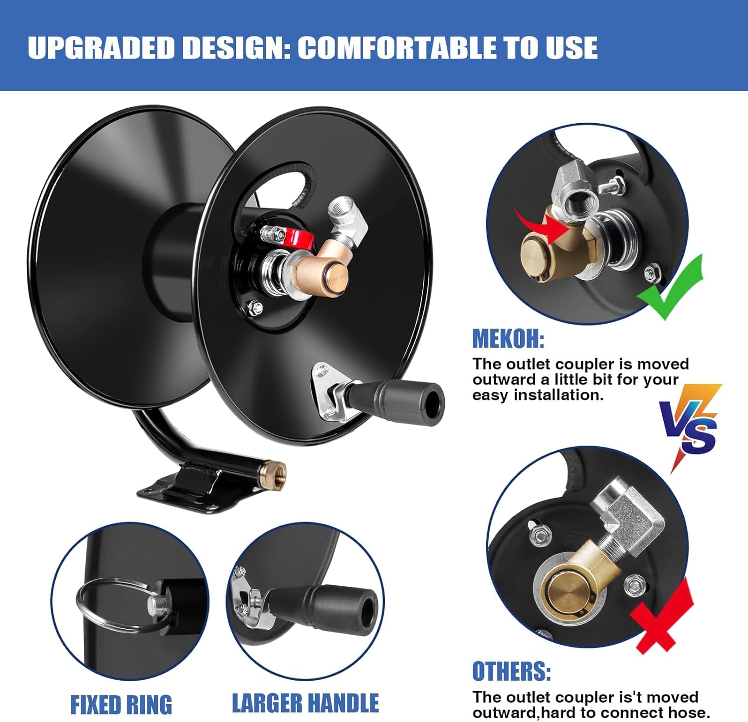 FOR YOUR CONVENIENCE: All the upgraded details of MEKOH pressure washer hose reel are to help you pull out and retract the hose quickly and easily, without any struggle. The enlarged hand crank is designed for quick retraction. The 90 degree elbow at the outlet protects the hose from kinks and bend damage, extending hose life. The fixed ring on the power washer hose reel prevents the hose holder from rolling during operation. Also, the red locking mechanism in the attachment can fix the hose