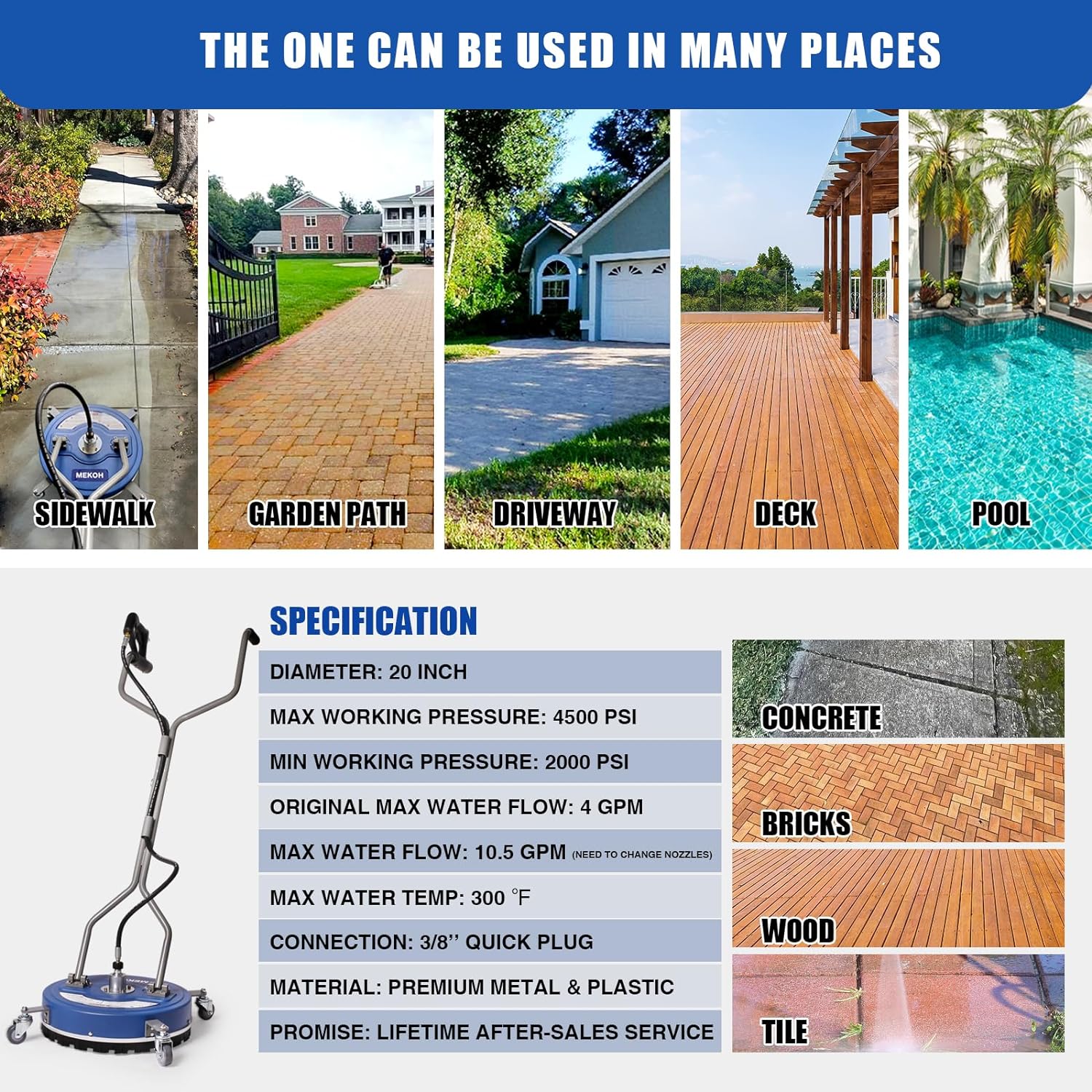 MEKOH Pressure Washer Surface Cleaner 20”, 4500PSI Power Washer Surface Cleaner Attachment with Wheels, Pressure Washer Accessory for Driveway Sidewalk Curb Deck Patio Cleaning, 3/8” Quick-Connect